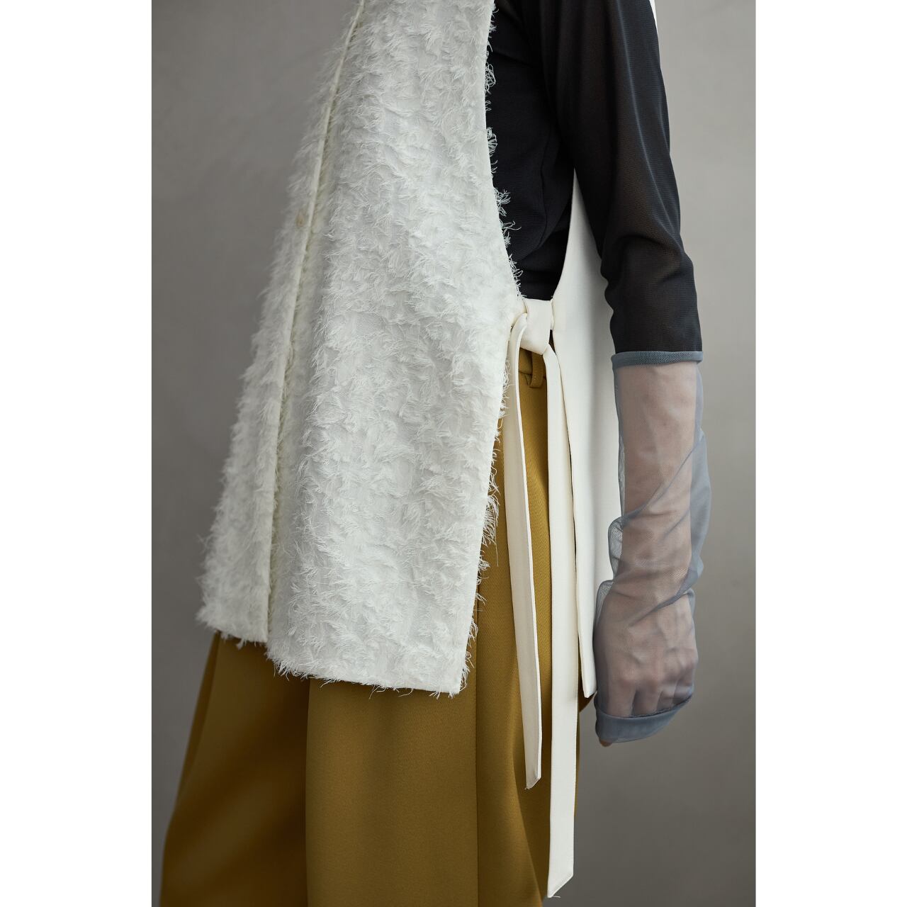 サイドのリボンでシルエットの調整が可能。ウエストを絞ってシャープに着こなすことも、ゆるく羽織ってラフな雰囲気に仕上げることもできます。