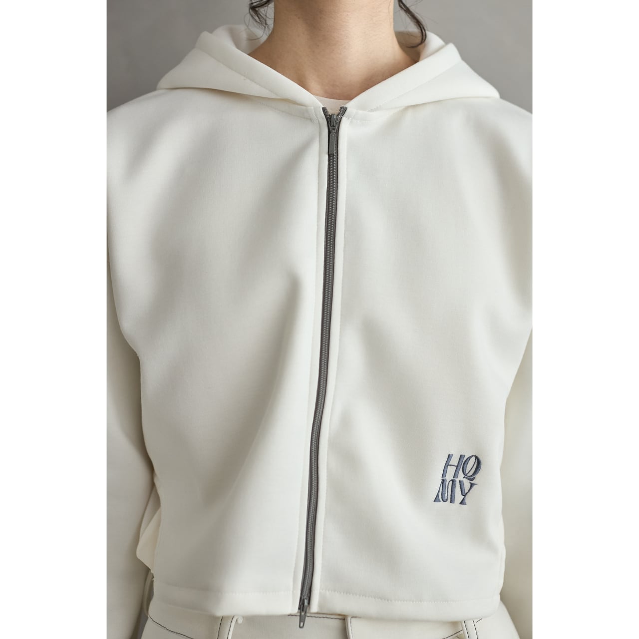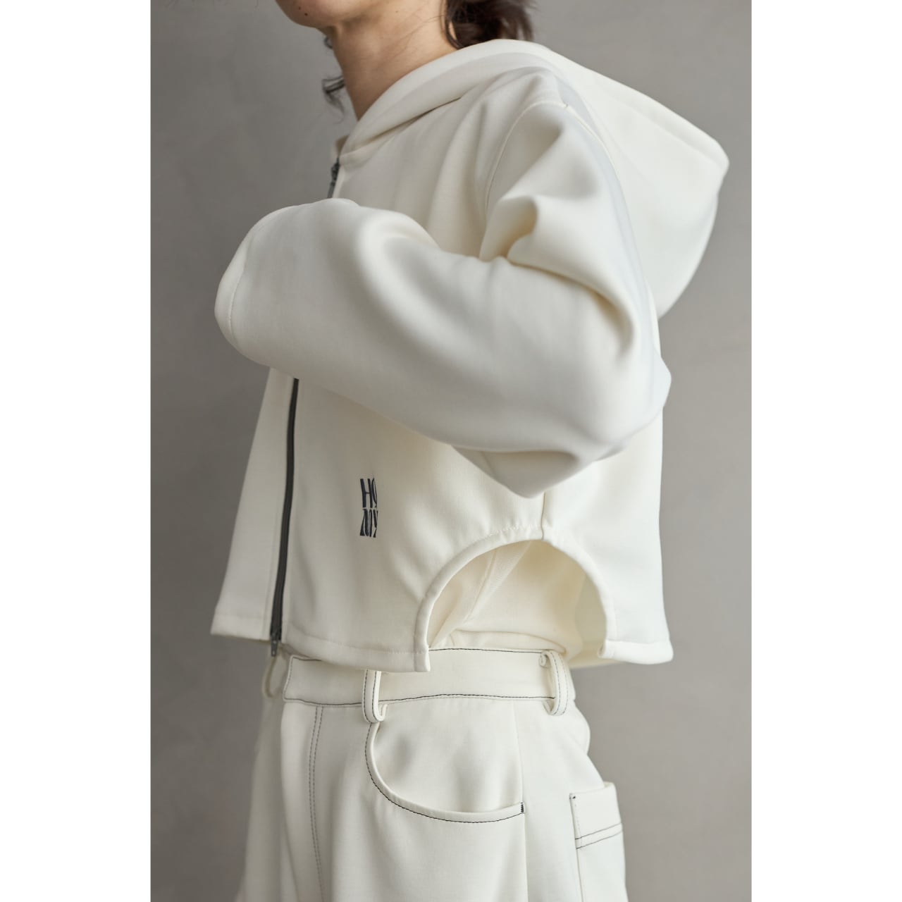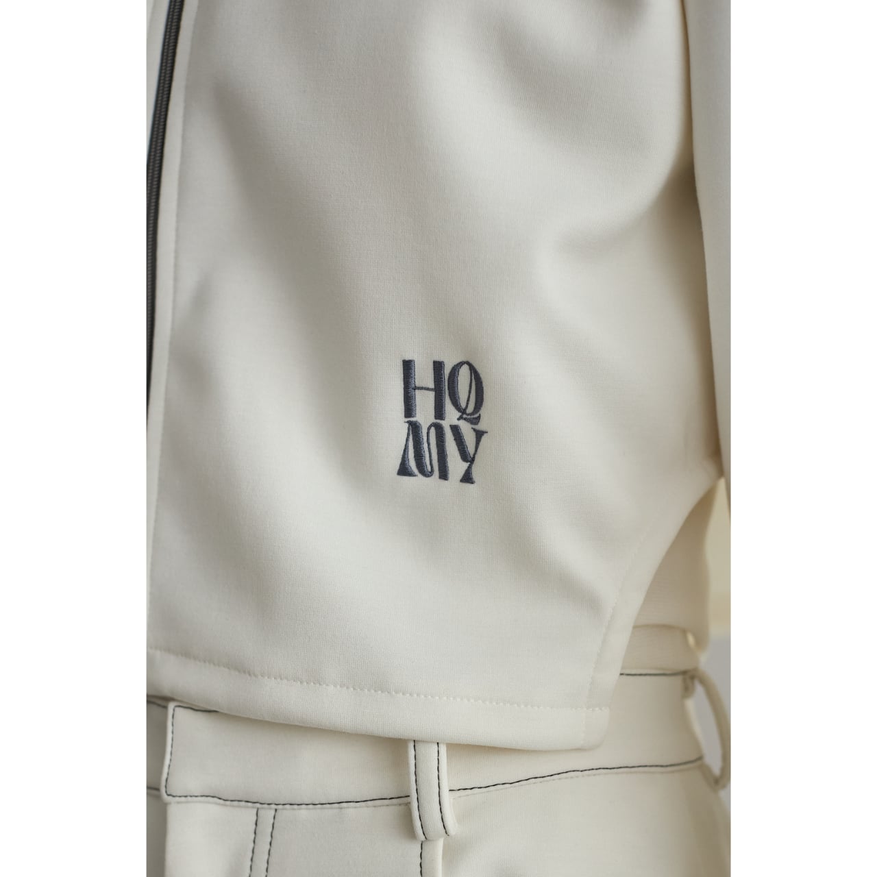 左右の脇裾はラウンドカットを施し、軽やかな印象と動きやすさをプラス。左前身頃には、ブランドオリジナルのメッセージ「HQMY(High quality makes you)」の刺しゅうをさりげなく配置し、アイデンティティを表現しました。