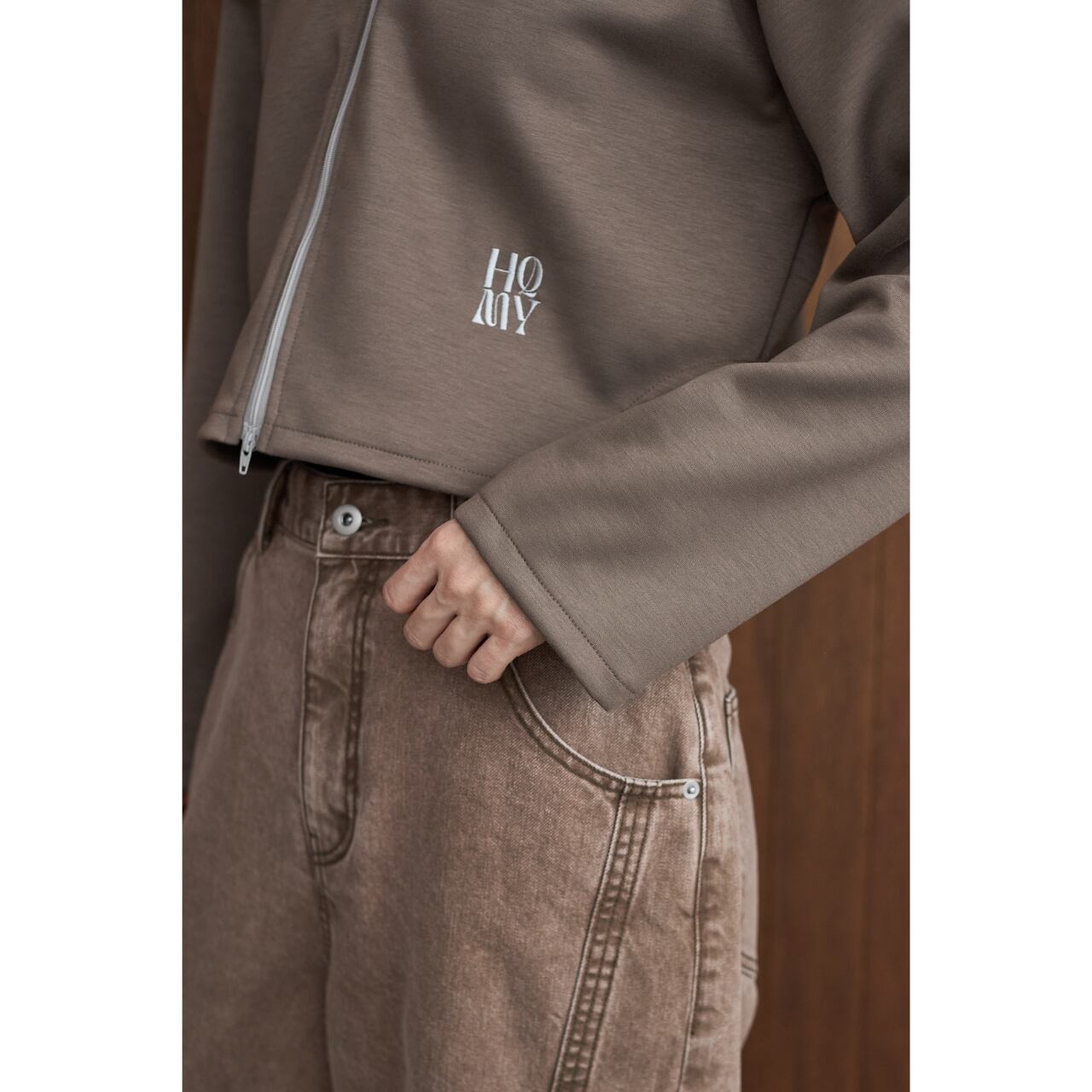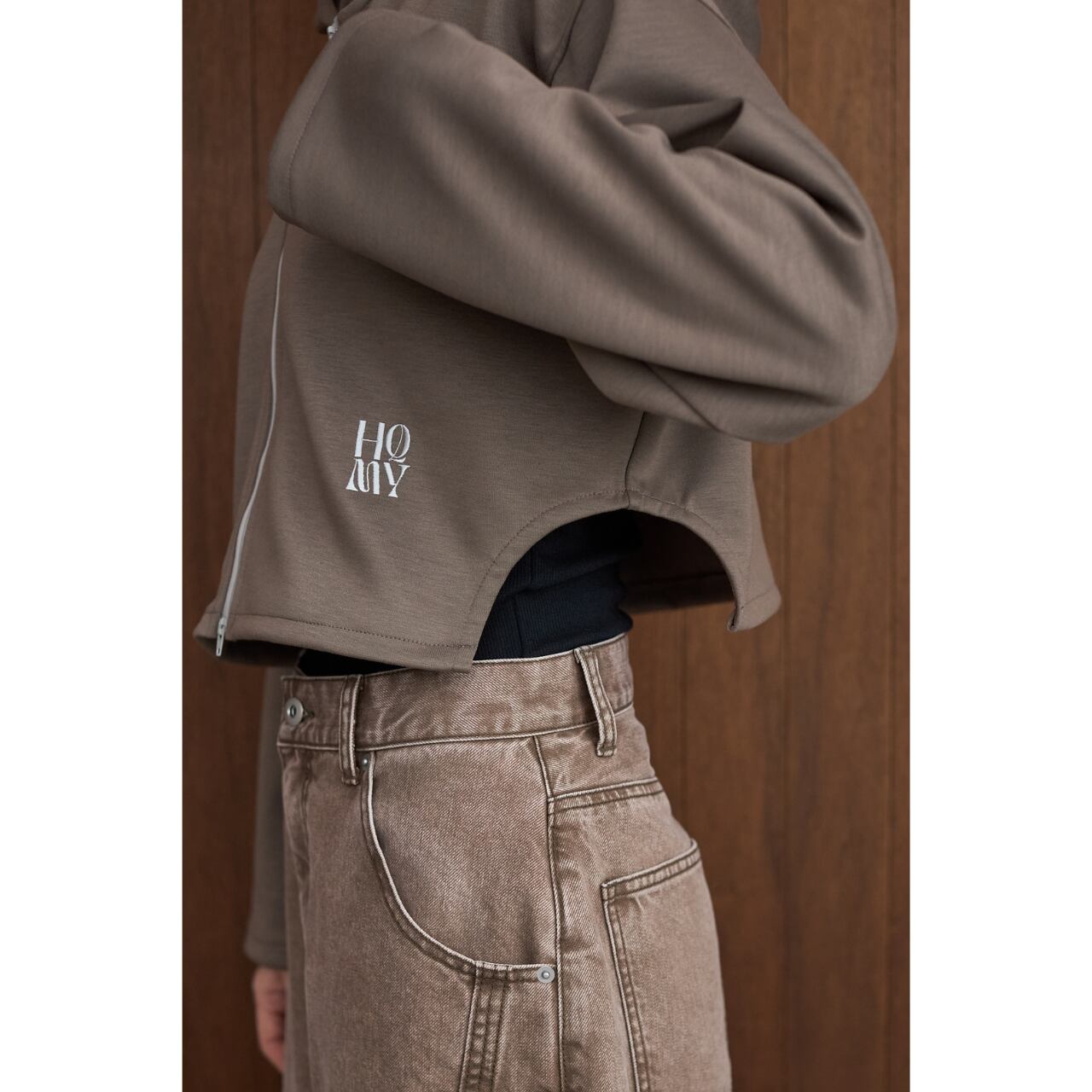 左右の脇裾はラウンドカットを施し、軽やかな印象と動きやすさをプラス。左前身頃には、ブランドオリジナルのメッセージ「HQMY(High quality makes you)」の刺しゅうをさりげなく配置し、アイデンティティを表現しました。