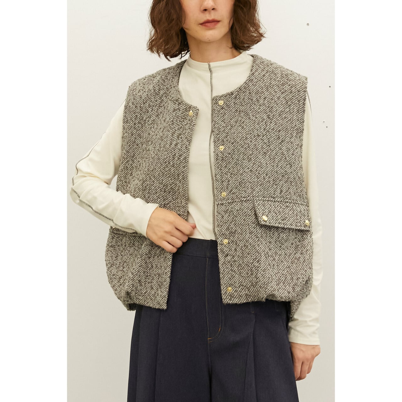 ▪ カットジャガードジレを重ねて、モードなレイヤードスタイルに。