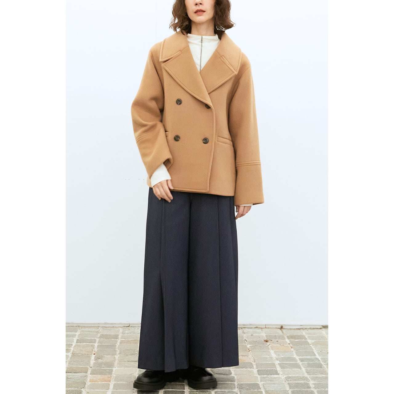贅沢に生地を使用した立体的なタックプリーツがポイント。動くたびに美しいドレープが広がり、モード感のある着こなしに。