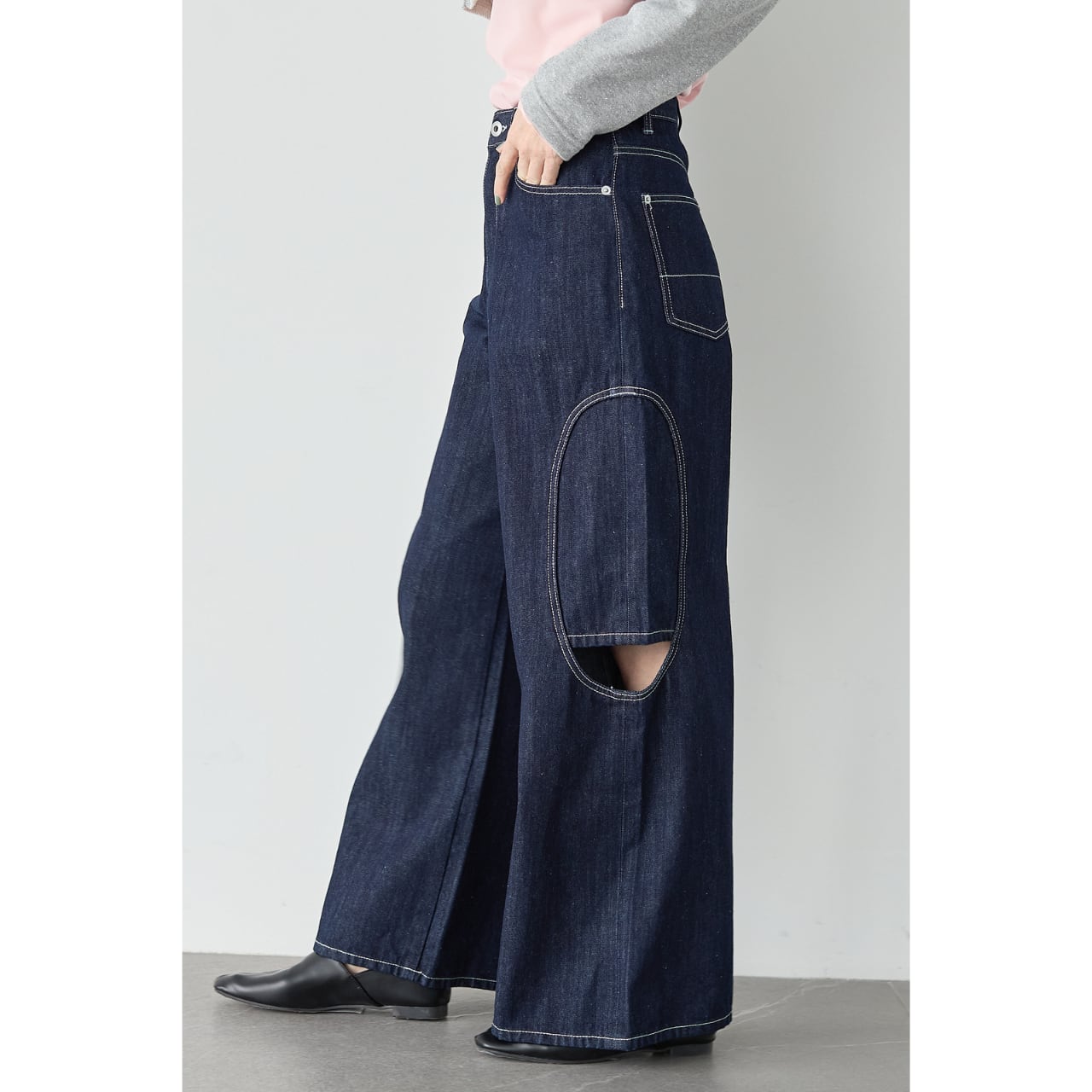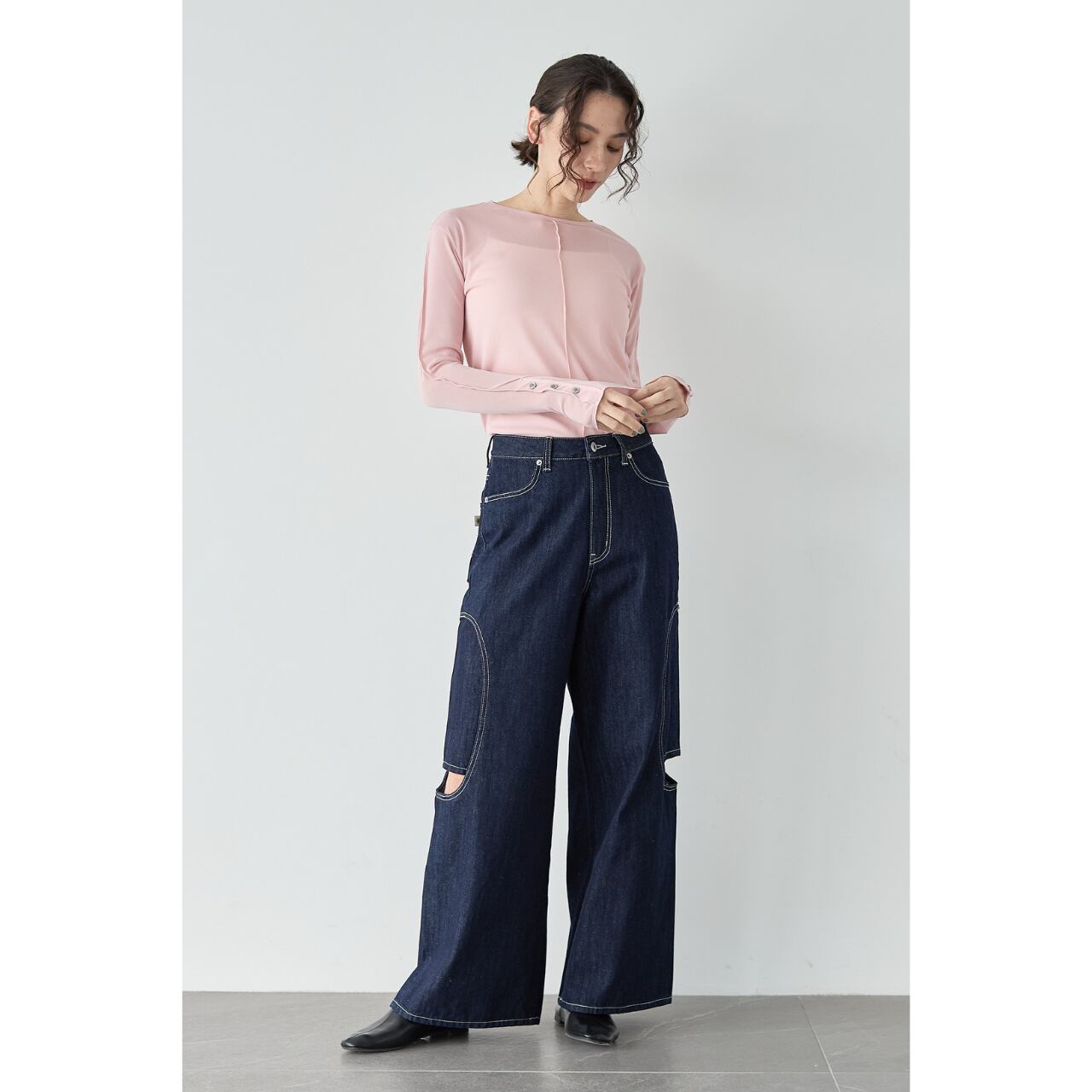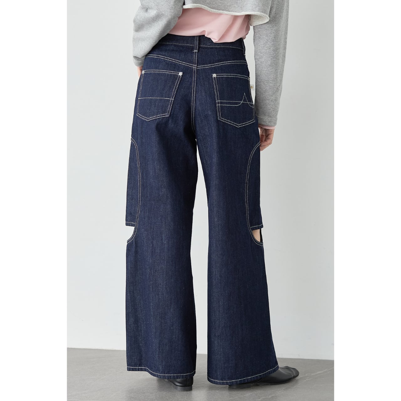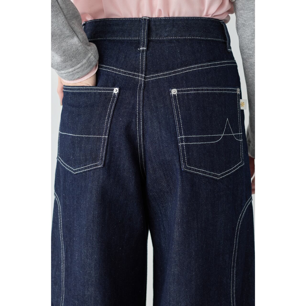 腰まわりはすっきりと、裾にかけて程よく広がるセミワイドシルエットで、美脚効果と体型カバーを両立。バックポケットにはALMOND*OILオリジナルのデザインステッチを施し、後ろ姿まで抜かりなく仕上げました。