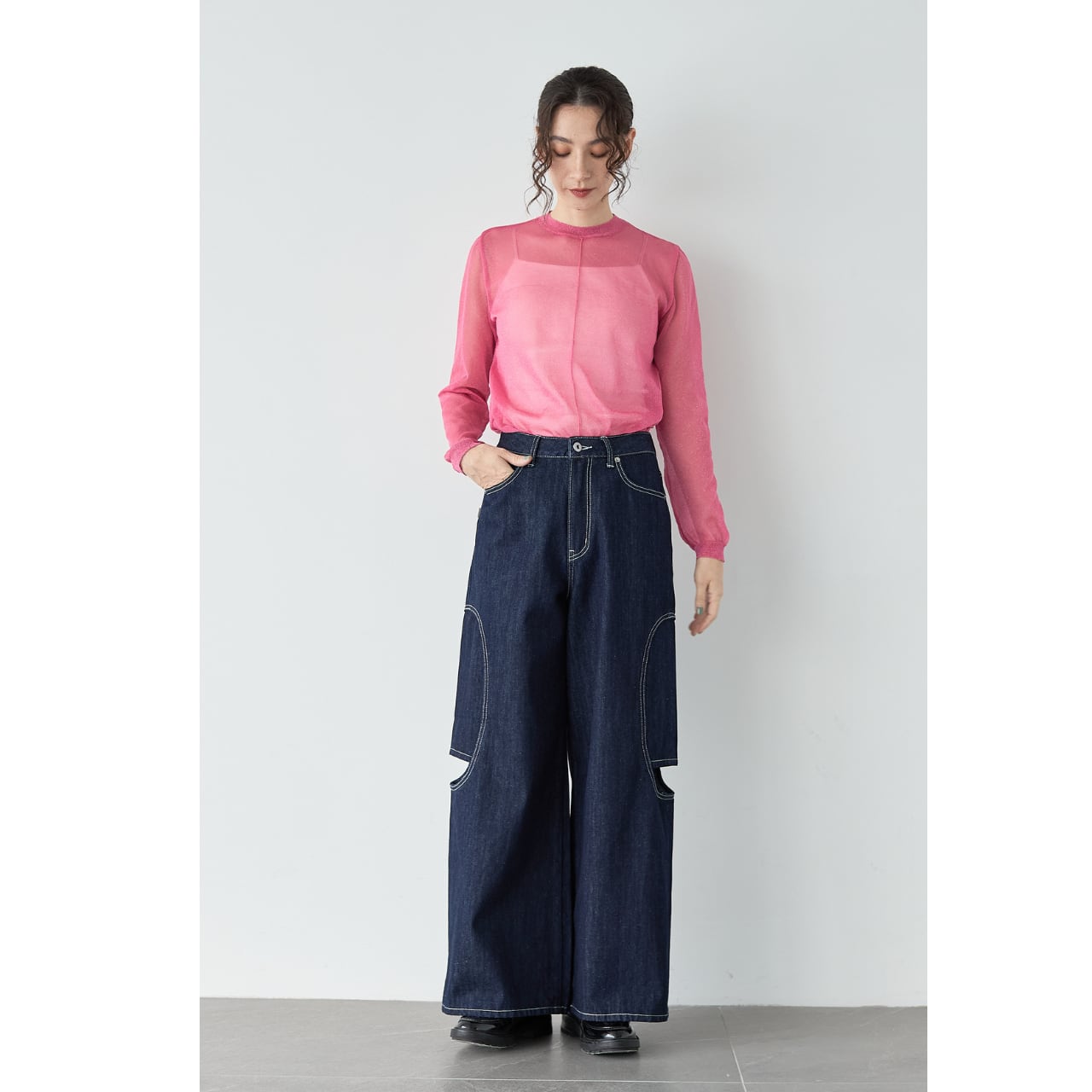とろみ素材のブラウスやシアートップスと合わせれば、きれいめカジュアルなスタイルに。