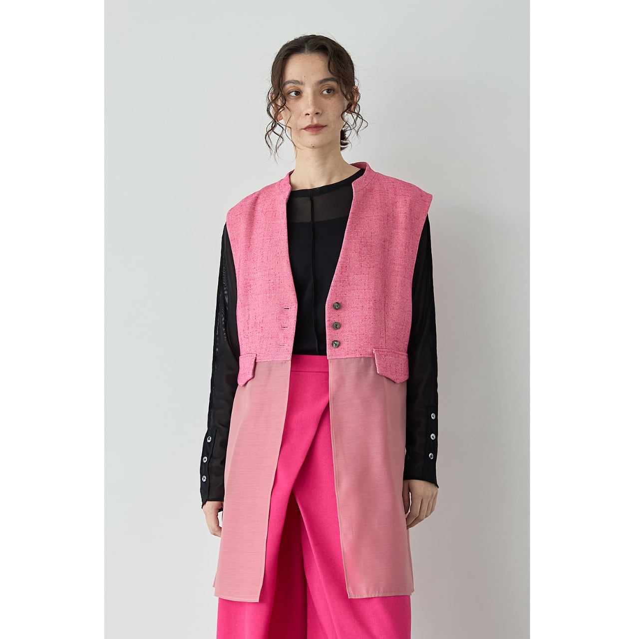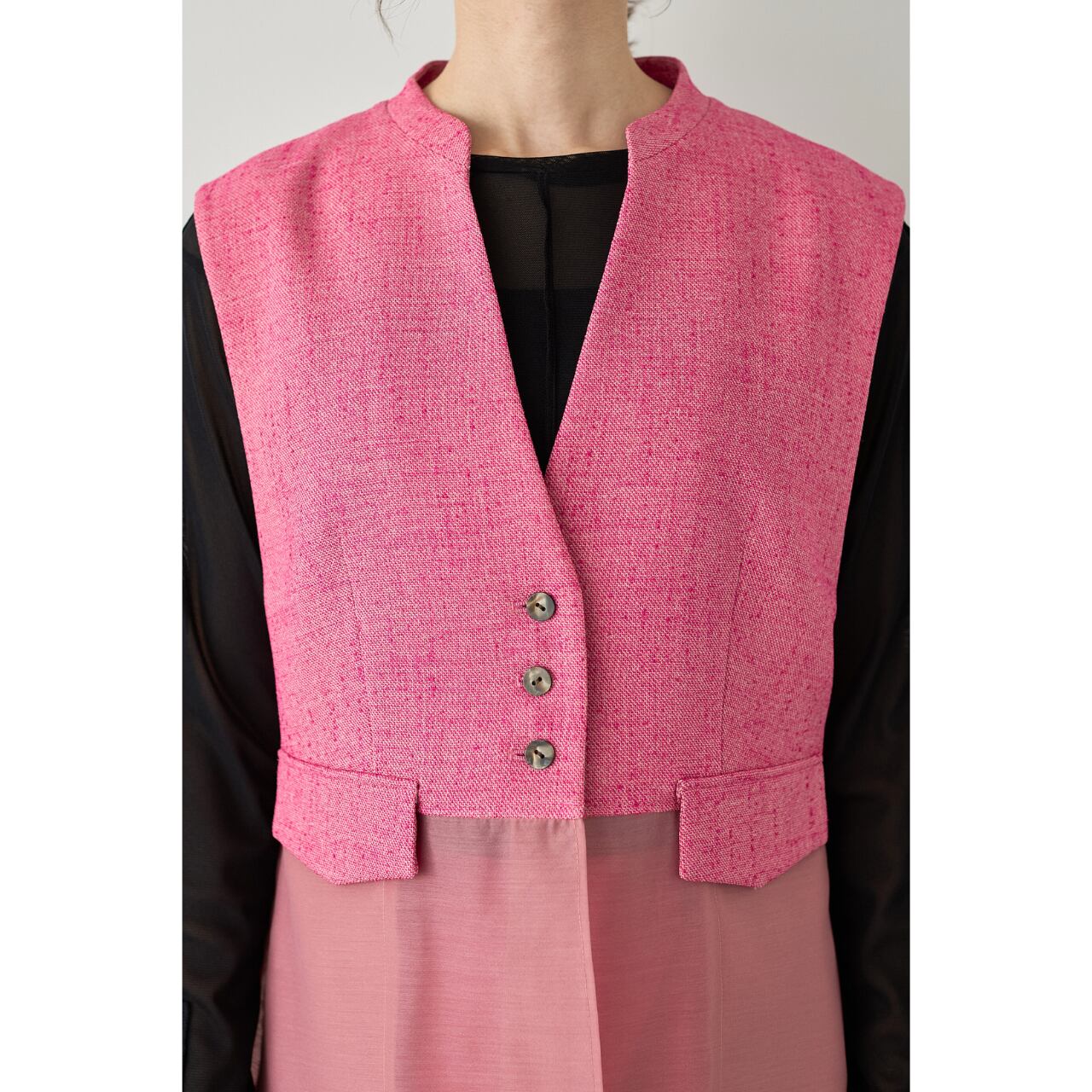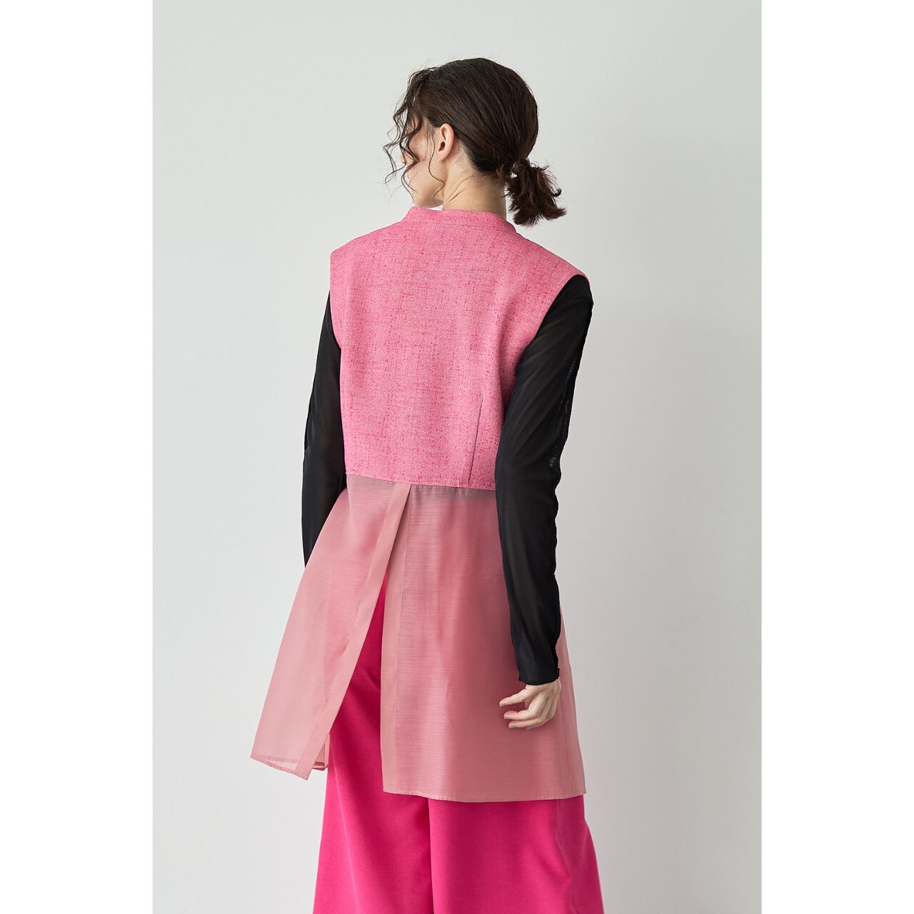表情のあるTRスラブツイードと、シアー感のある軽やかなシフォン素材をドッキングした、レイヤード見えのロング丈ジレ。