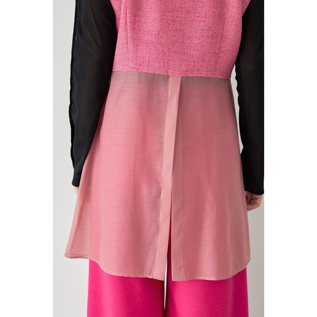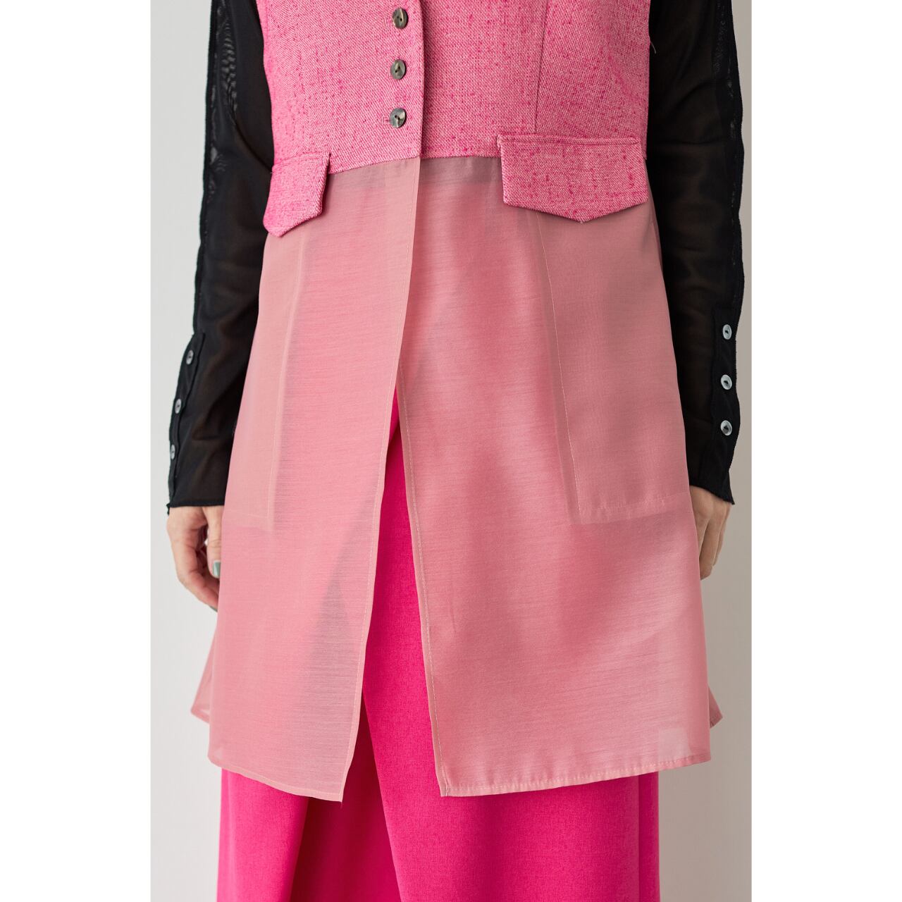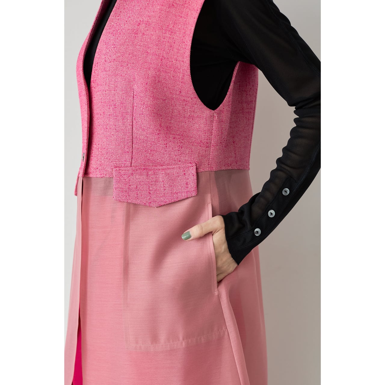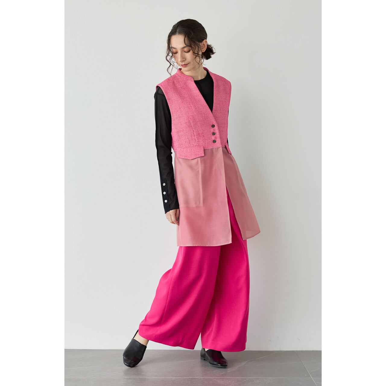 表情のあるTRスラブツイードと、シアー感のある軽やかなシフォン素材をドッキングした、レイヤード見えのロング丈ジレ。