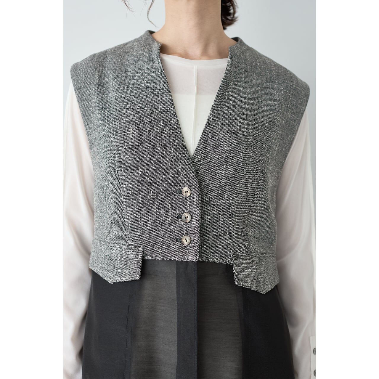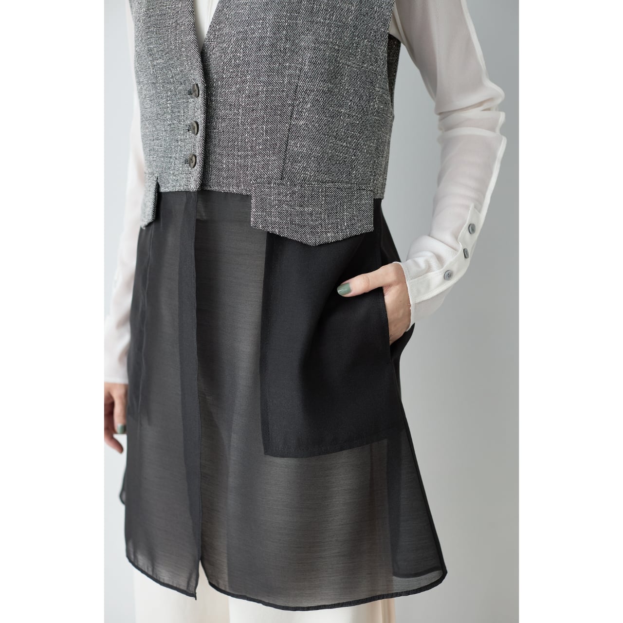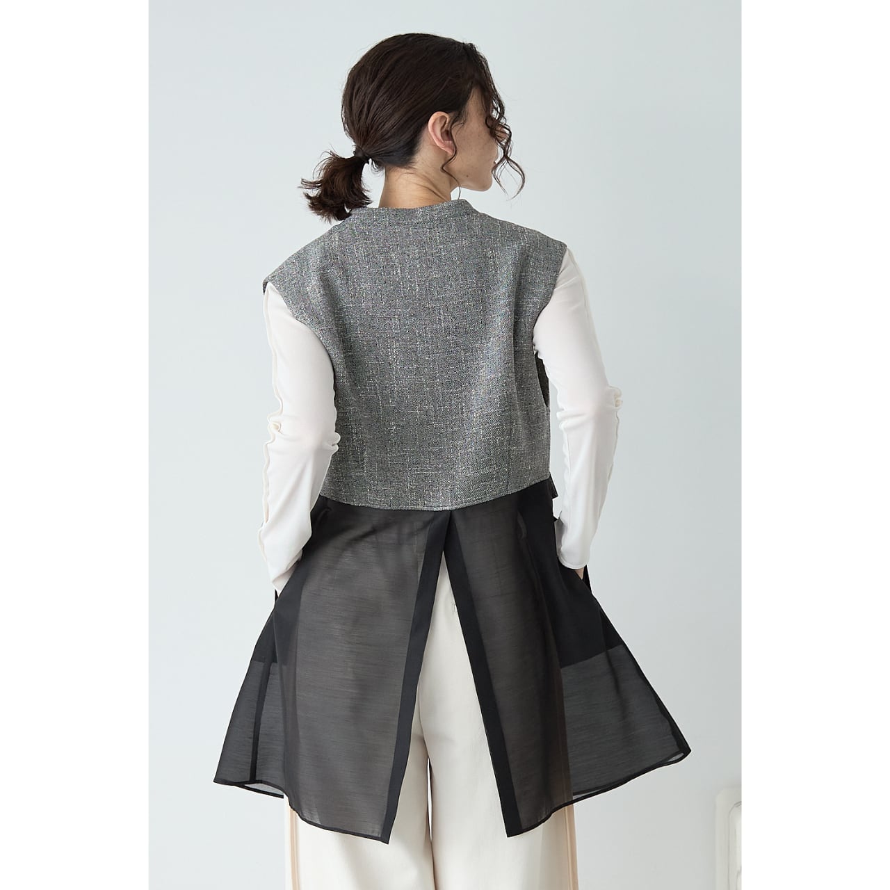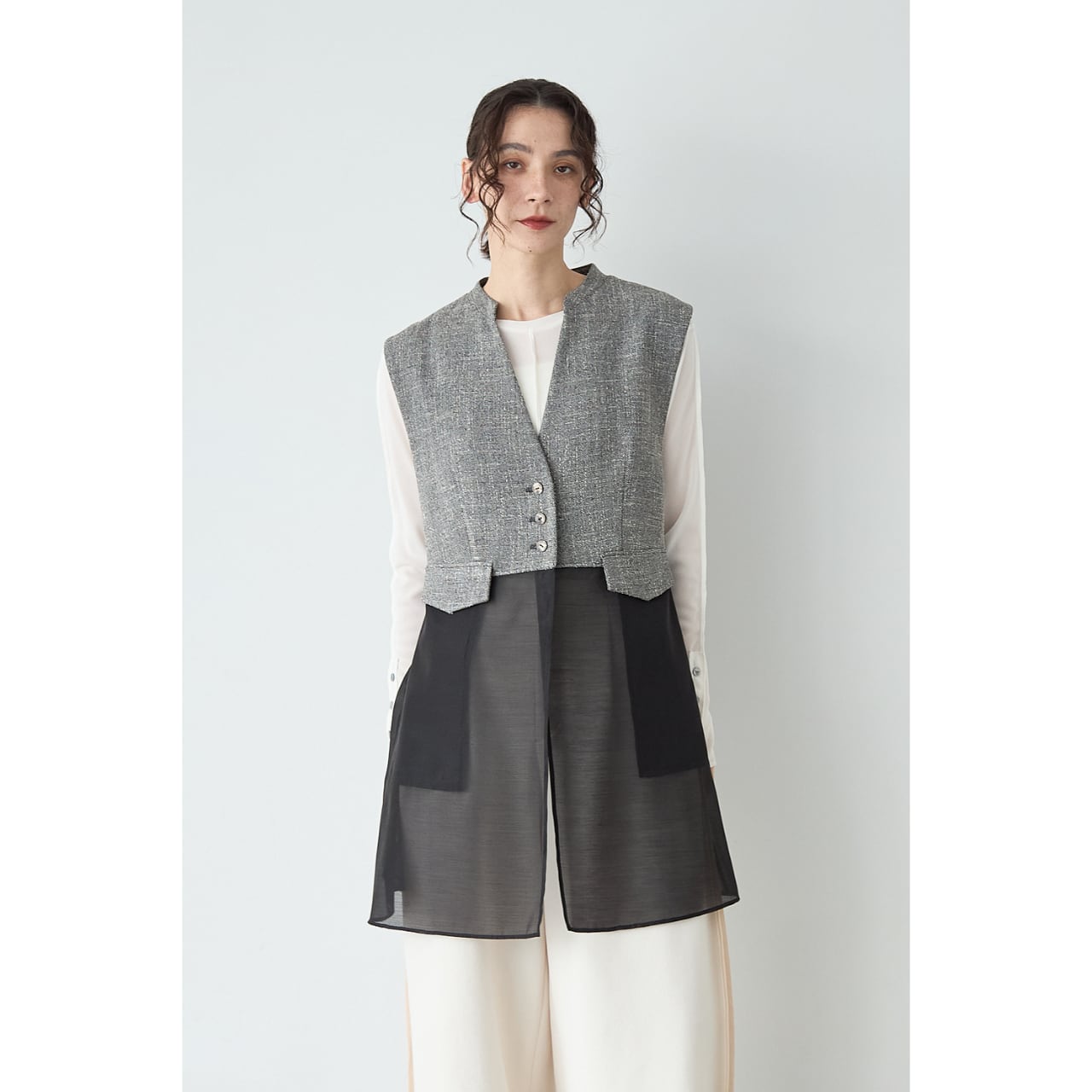 表情のあるTRスラブツイードと、シアー感のある軽やかなシフォン素材をドッキングした、レイヤード見えのロング丈ジレ。
