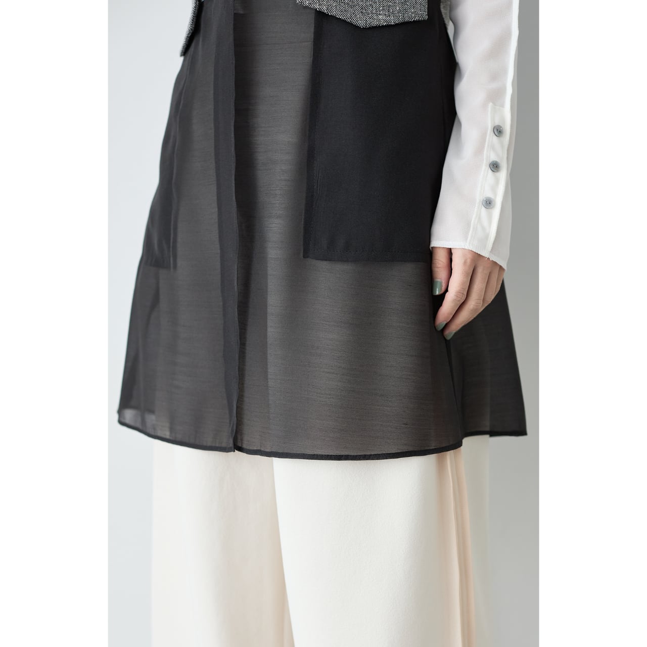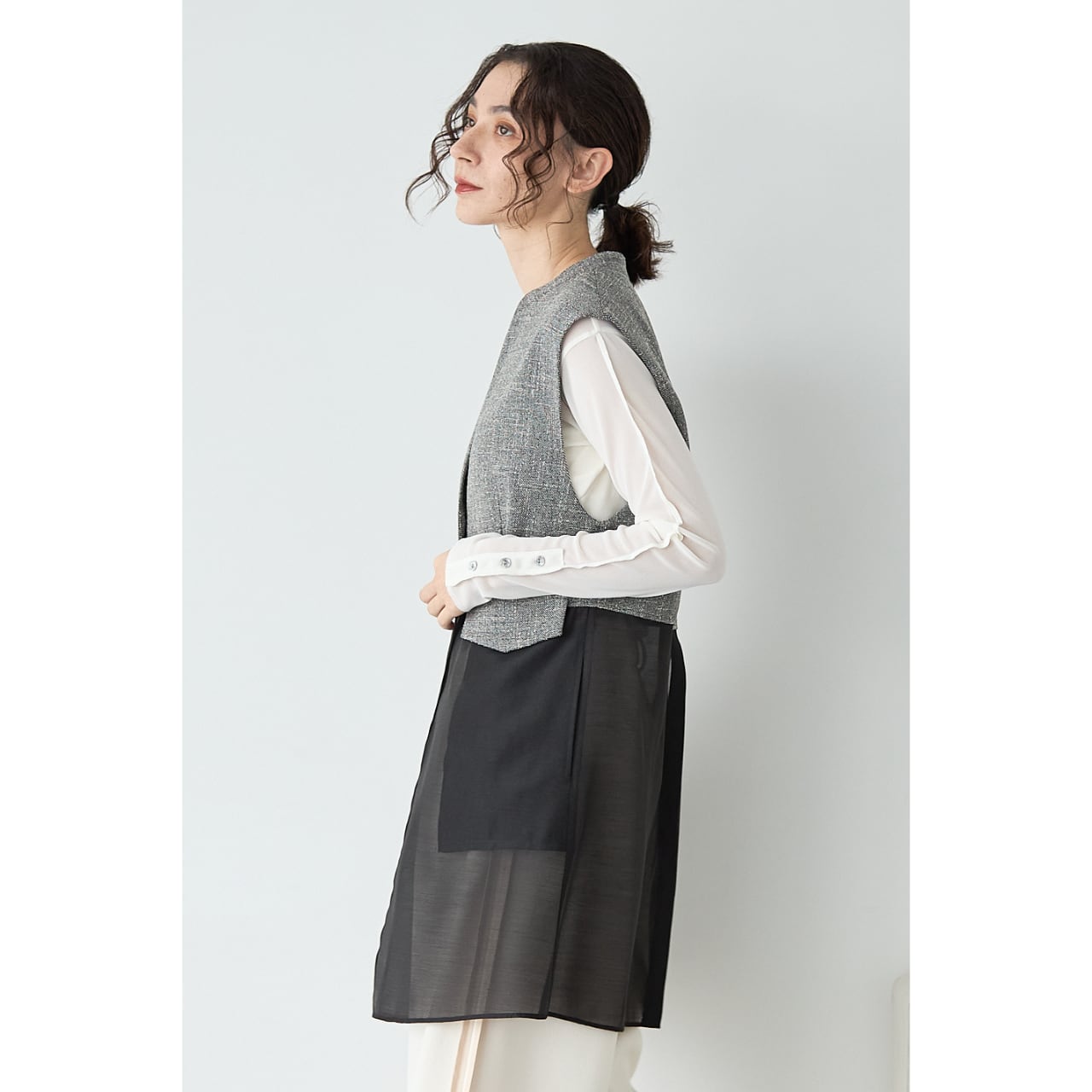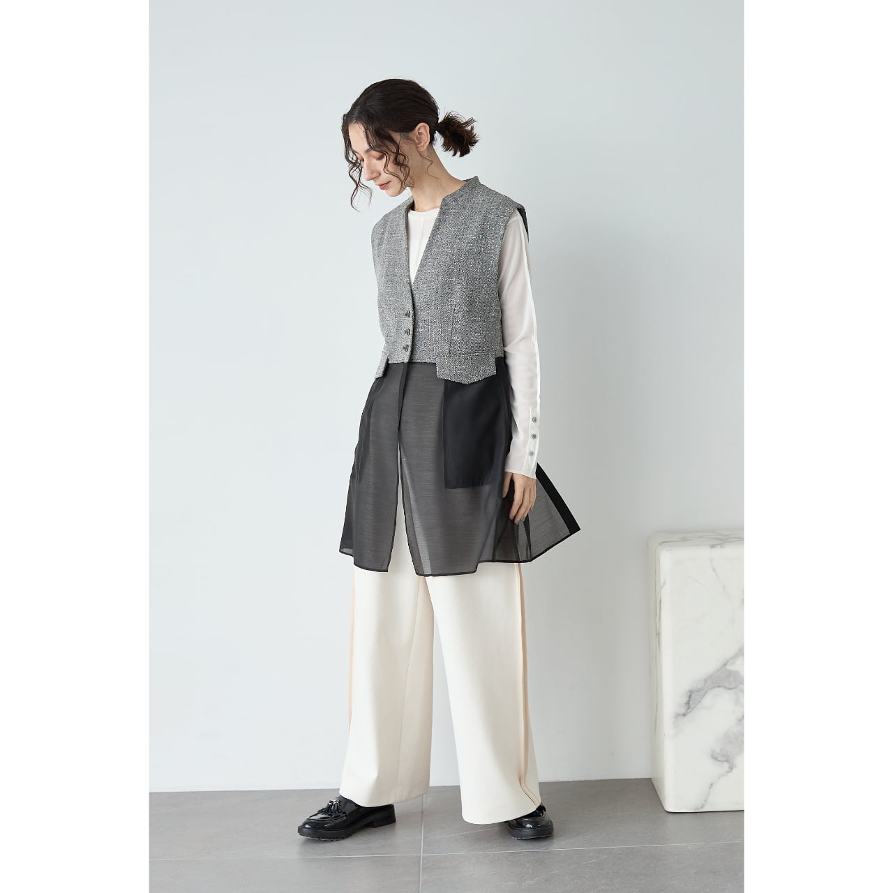 表情のあるTRスラブツイードと、シアー感のある軽やかなシフォン素材をドッキングした、レイヤード見えのロング丈ジレ。