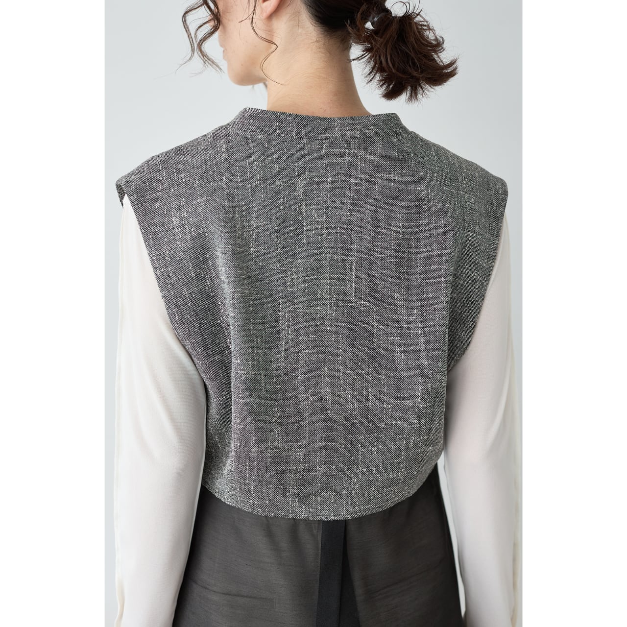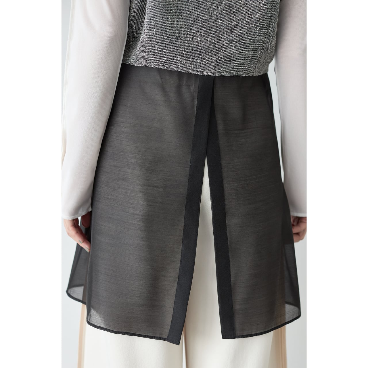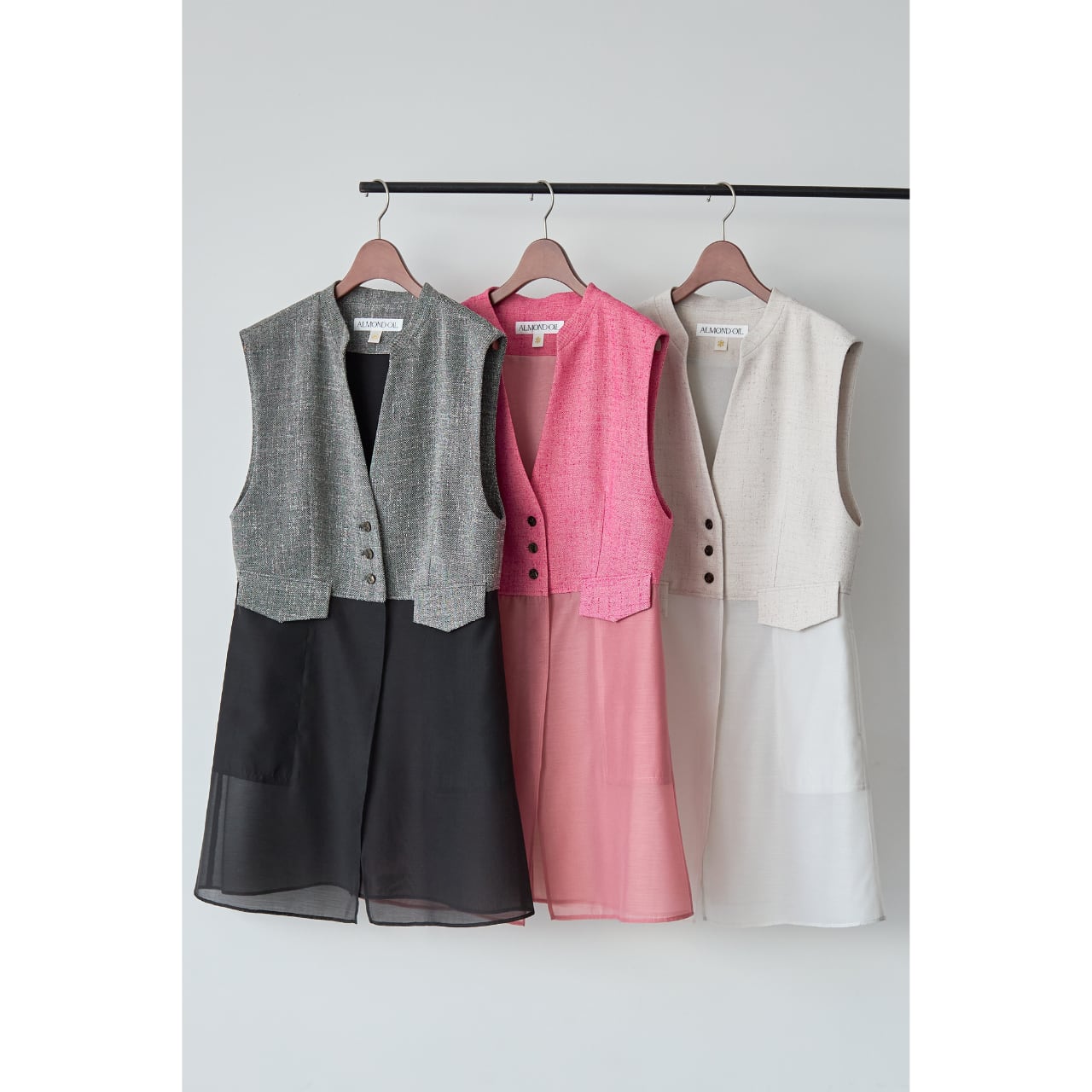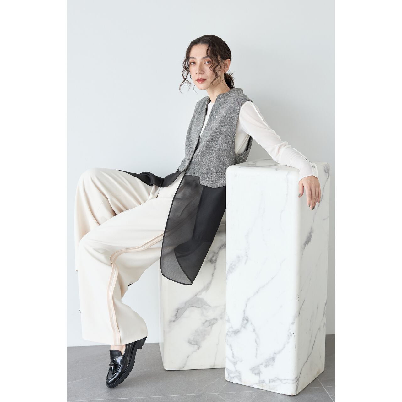 表情のあるTRスラブツイードと、シアー感のある軽やかなシフォン素材をドッキングした、レイヤード見えのロング丈ジレ。