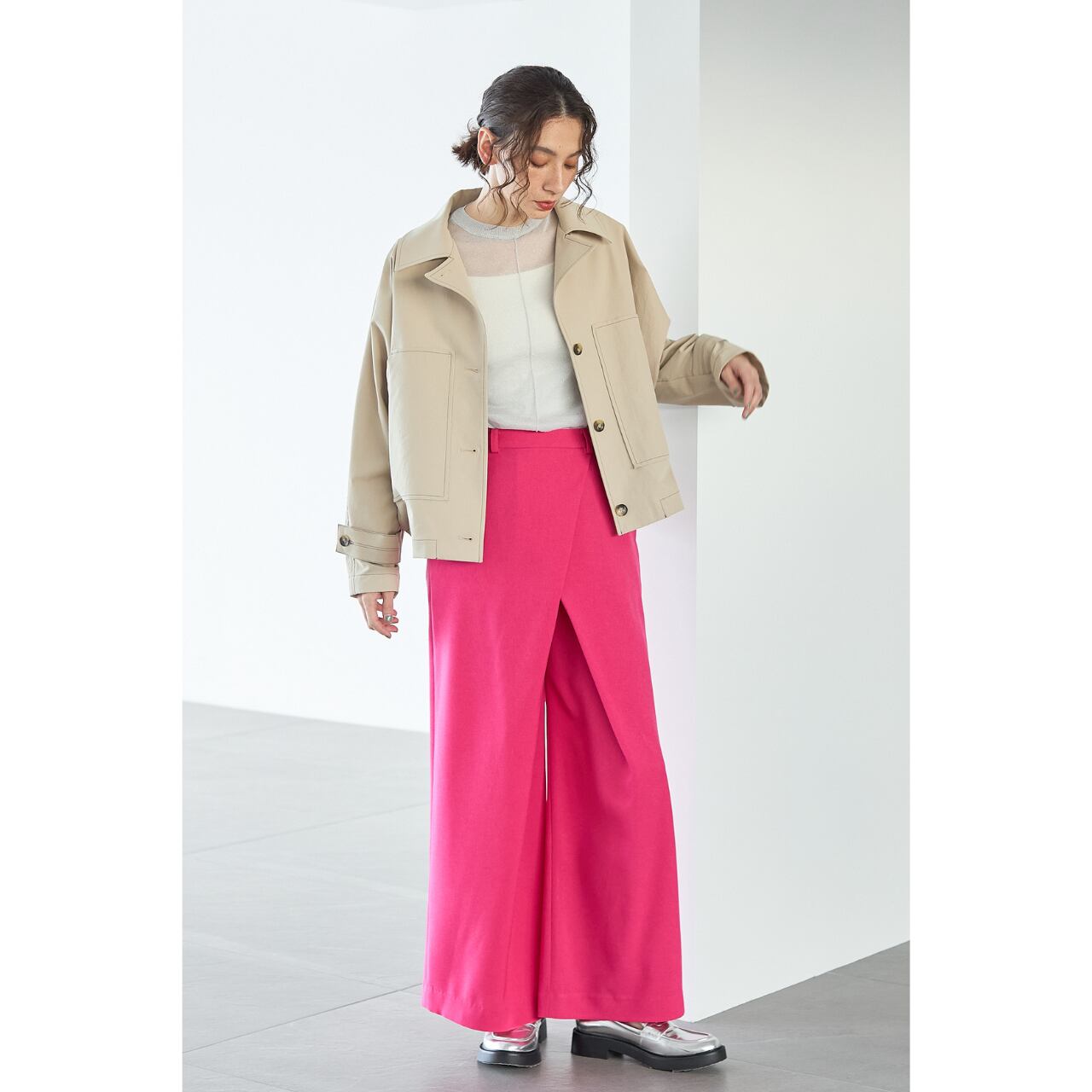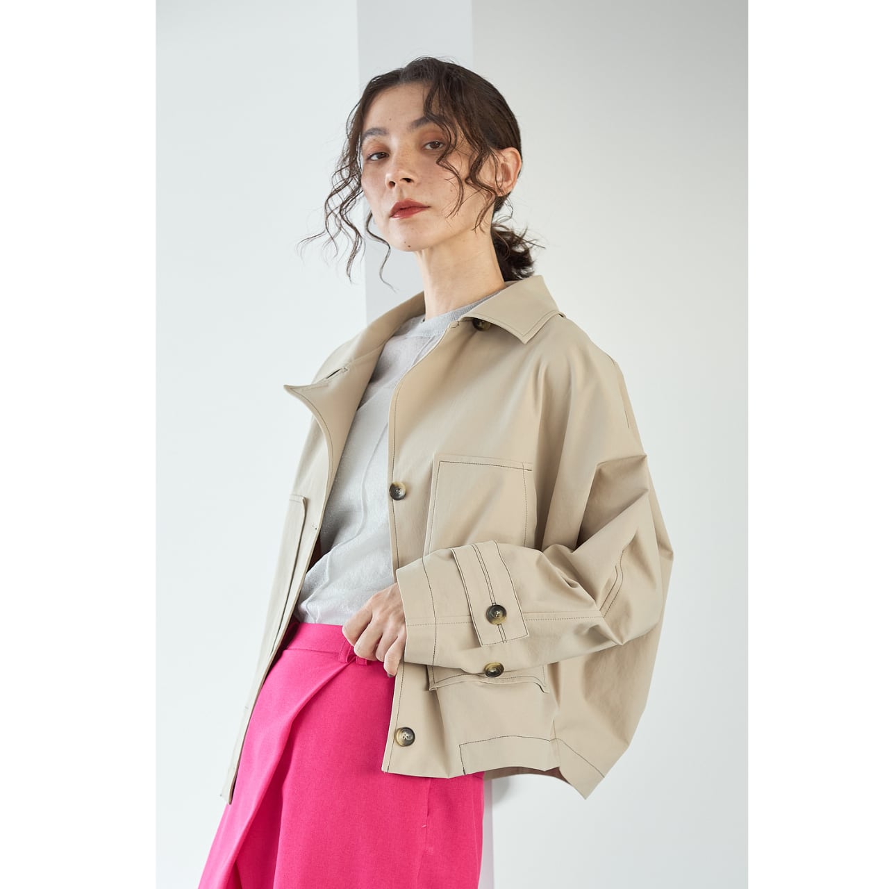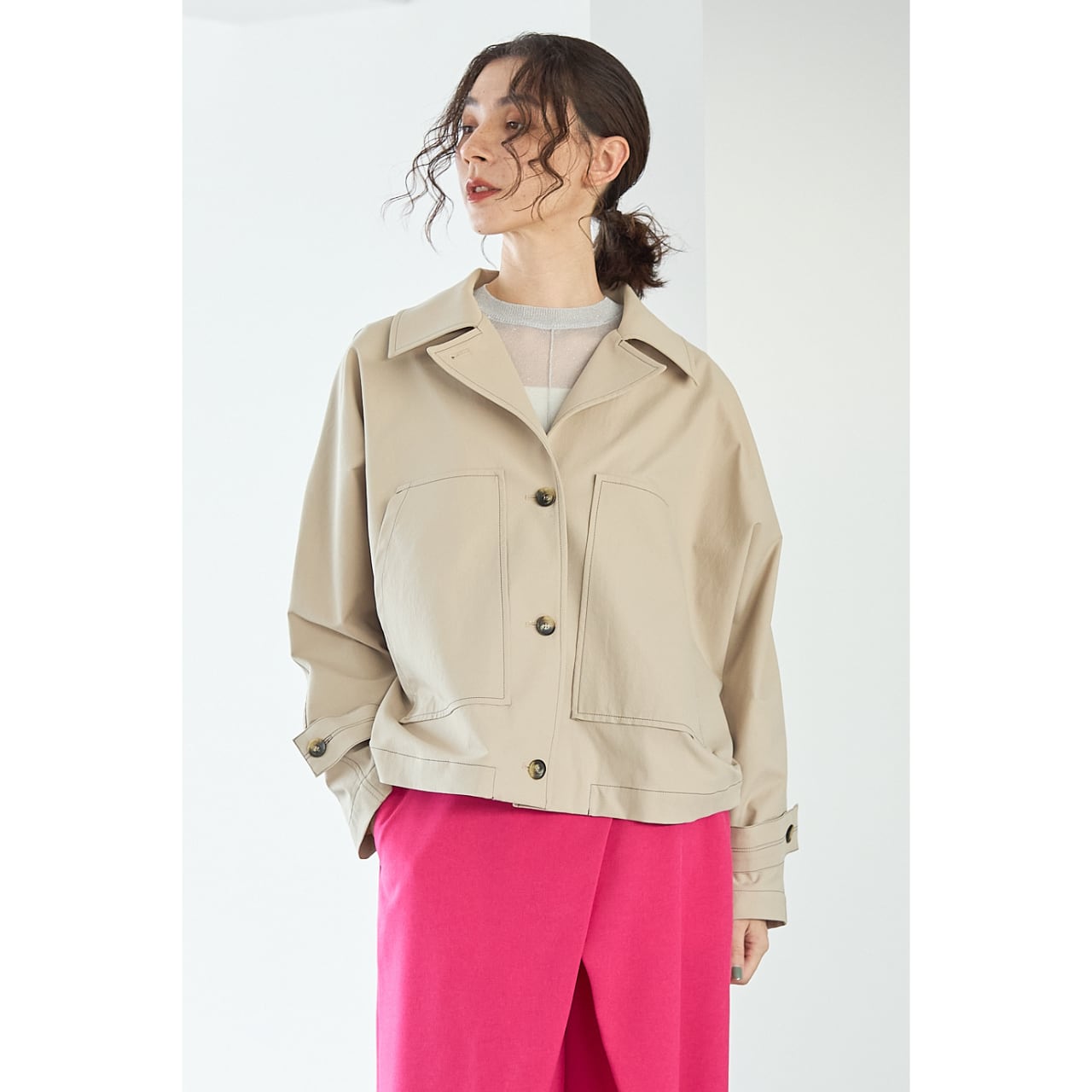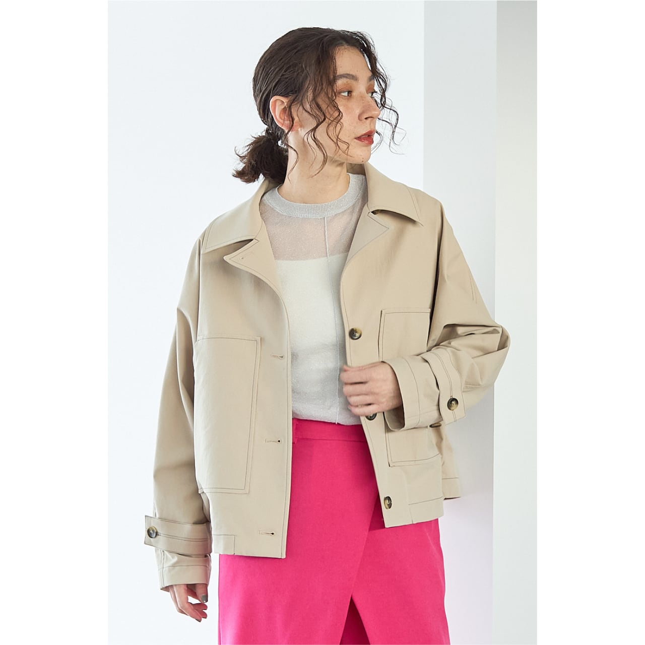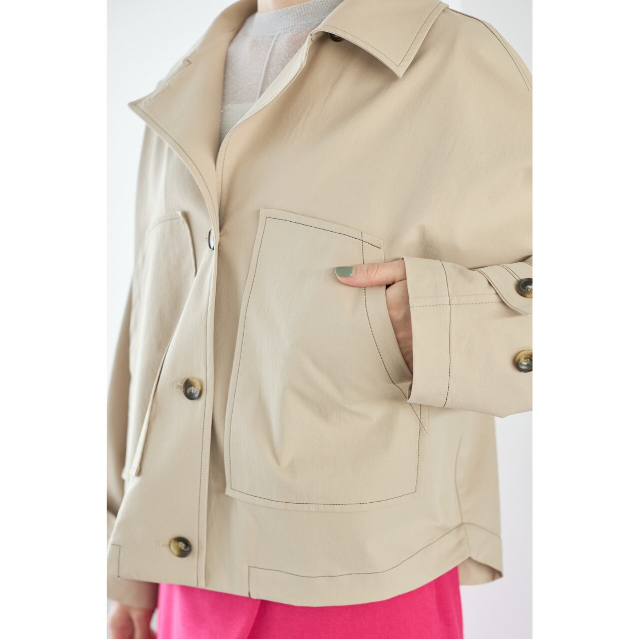 ショート丈ながらもコートライクな印象で、季節の変わり目の主役アウターとして活躍します。