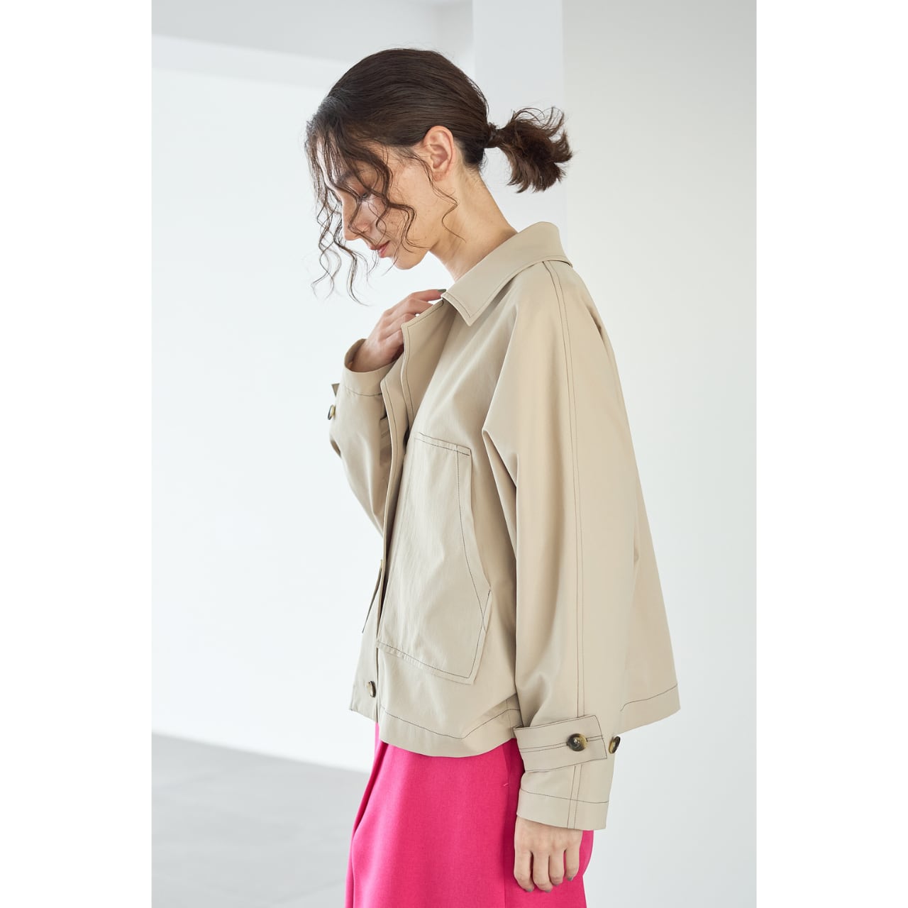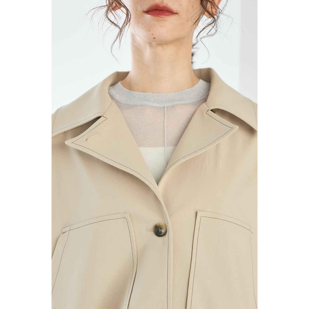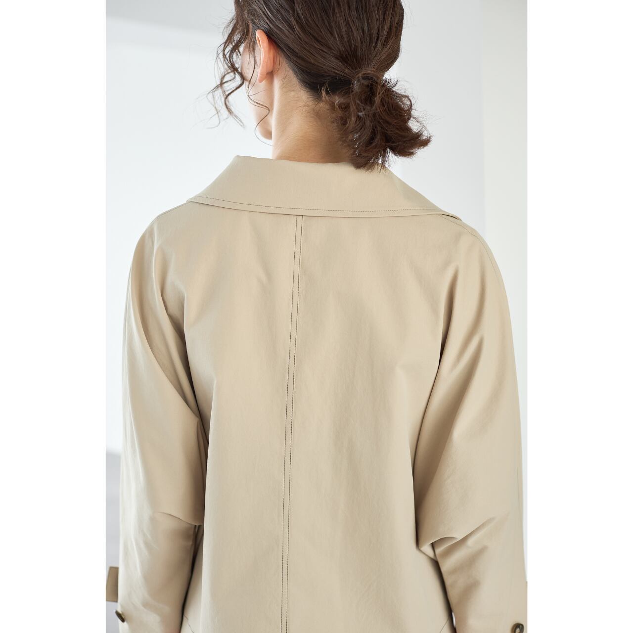 トレンチコートのような上品な衿元と、ブルゾンの軽快さを掛け合わせた2WAY見えデザインで、きれいめにもカジュアルにも対応。