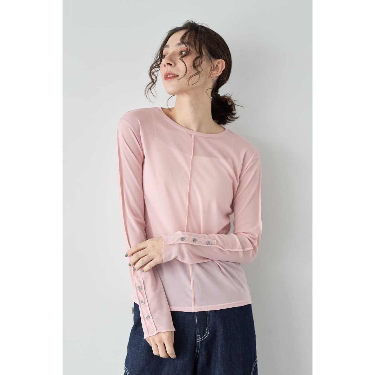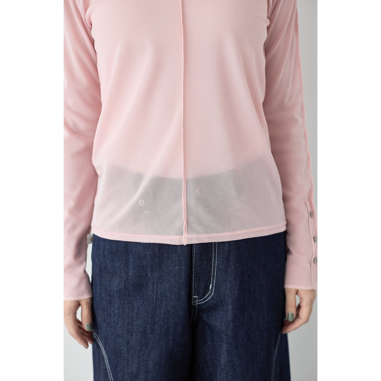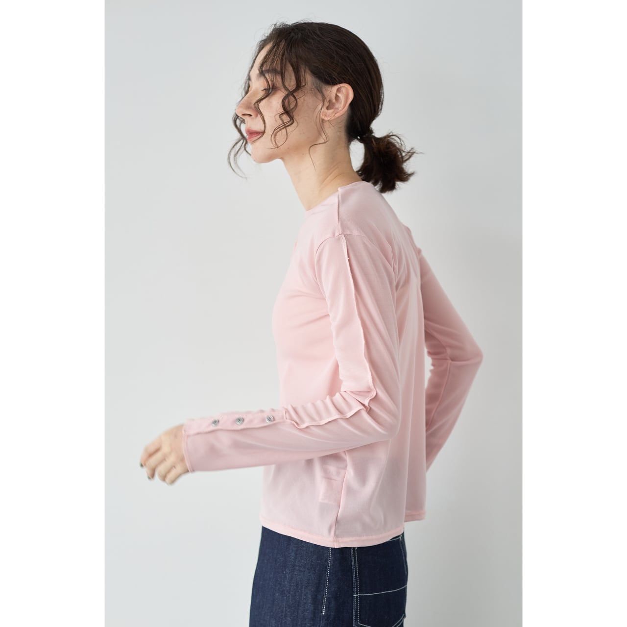 袖口には見せかけボタンのデザインを施し、ジャケットやオールインワンから覗く袖が、スタイリングのアクセントに。