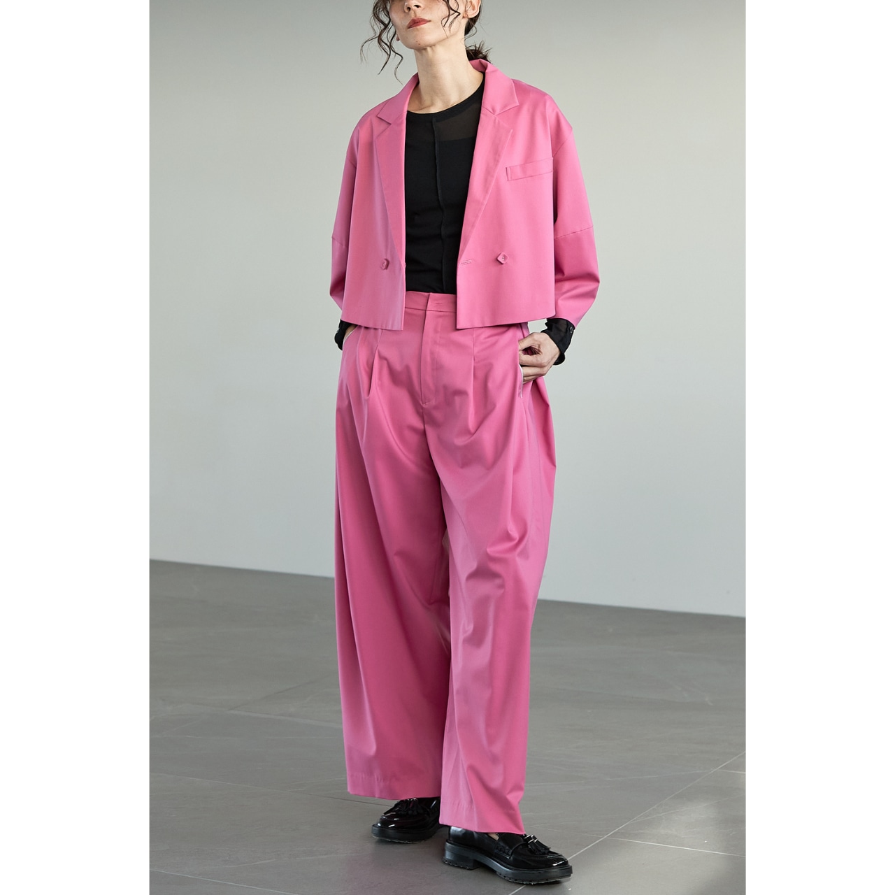 同素材の261A3107「コクーンスリーブ ショートジャケット」と合わせれば、セットアップとして着用可能。