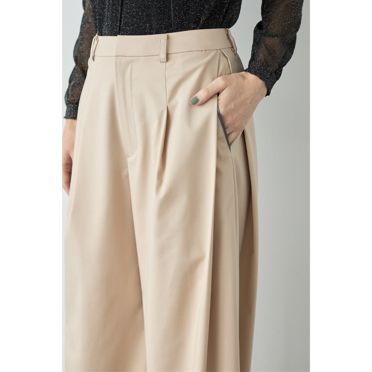 タックの内側に配したポケット口にはパイピングをあしらい、細部まで上品に仕上げました。
