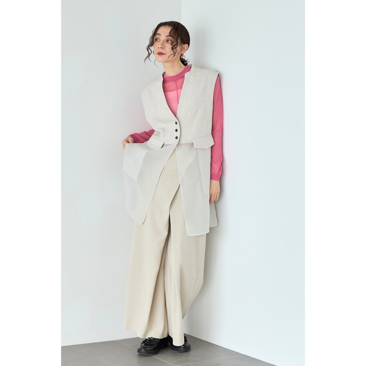 ジャケットやジレのインナーに合わせれば、程よく華やかなきちんとスタイルに。