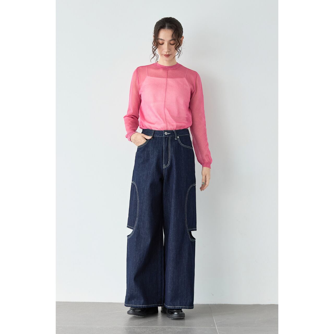 身体のラインを拾いにくい編み地に仕上げているため、一枚でも安心して着用できます。