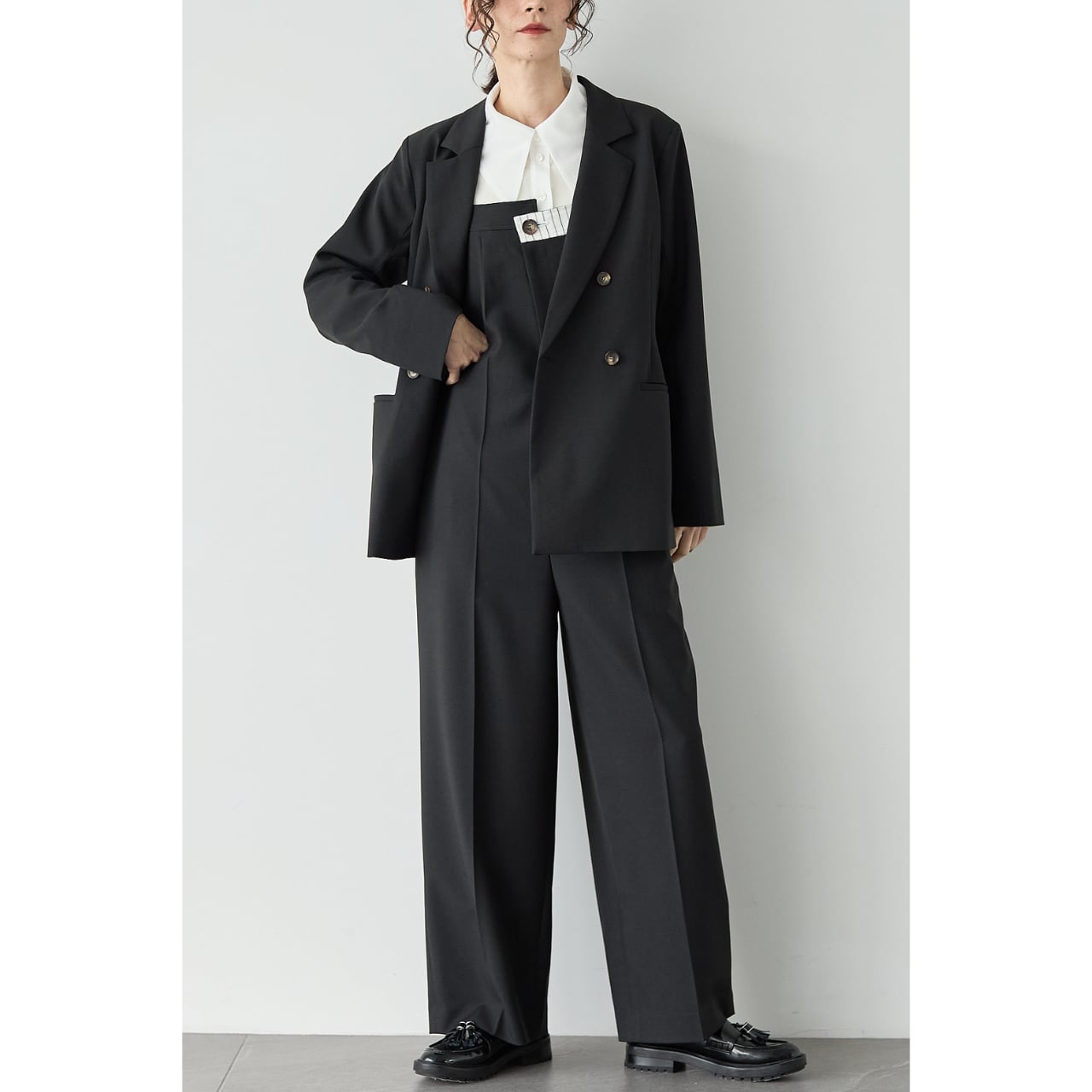同素材の「フロントアシンメトリー サロペット」と合わせれば、セットアップとして着用可能。