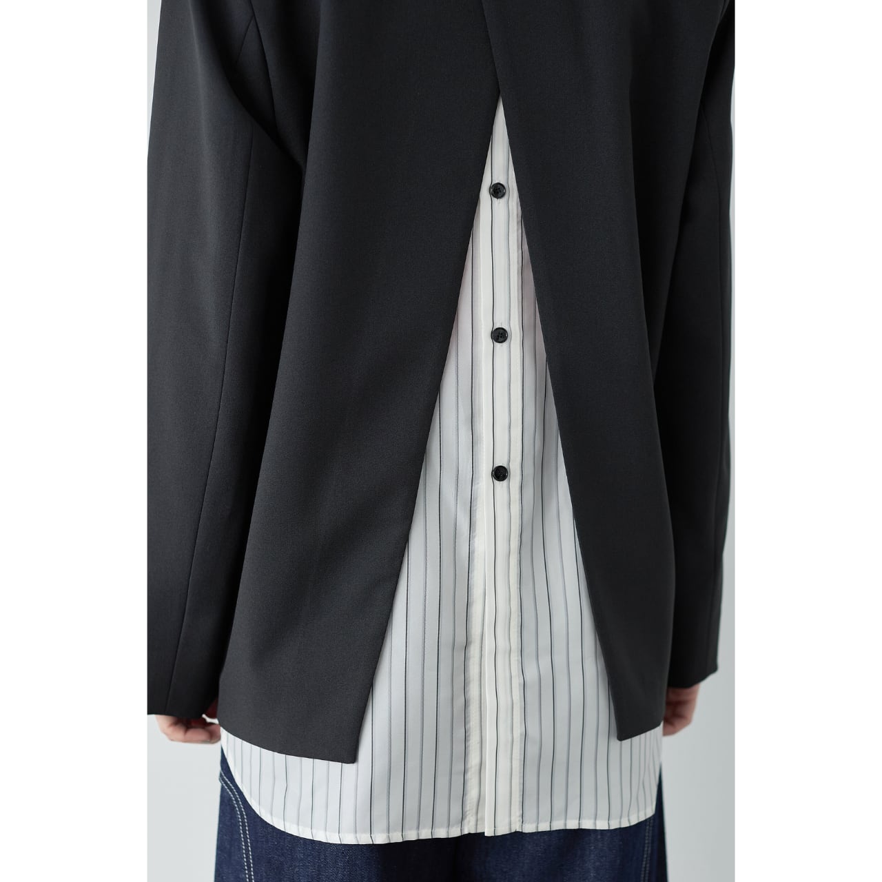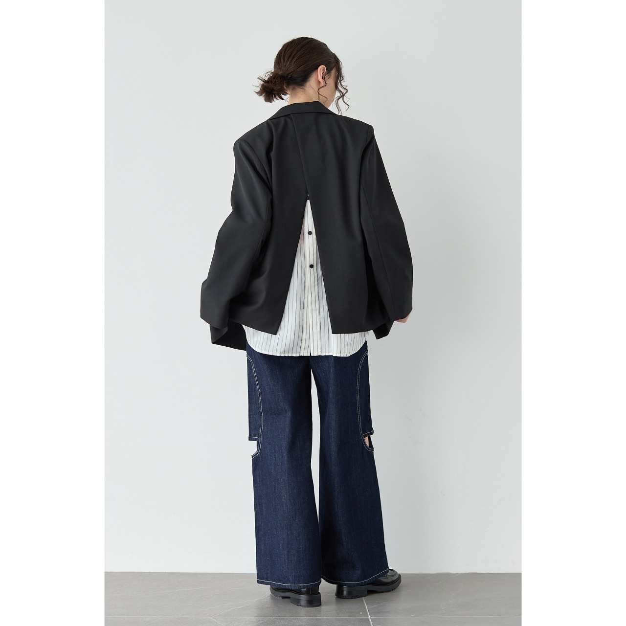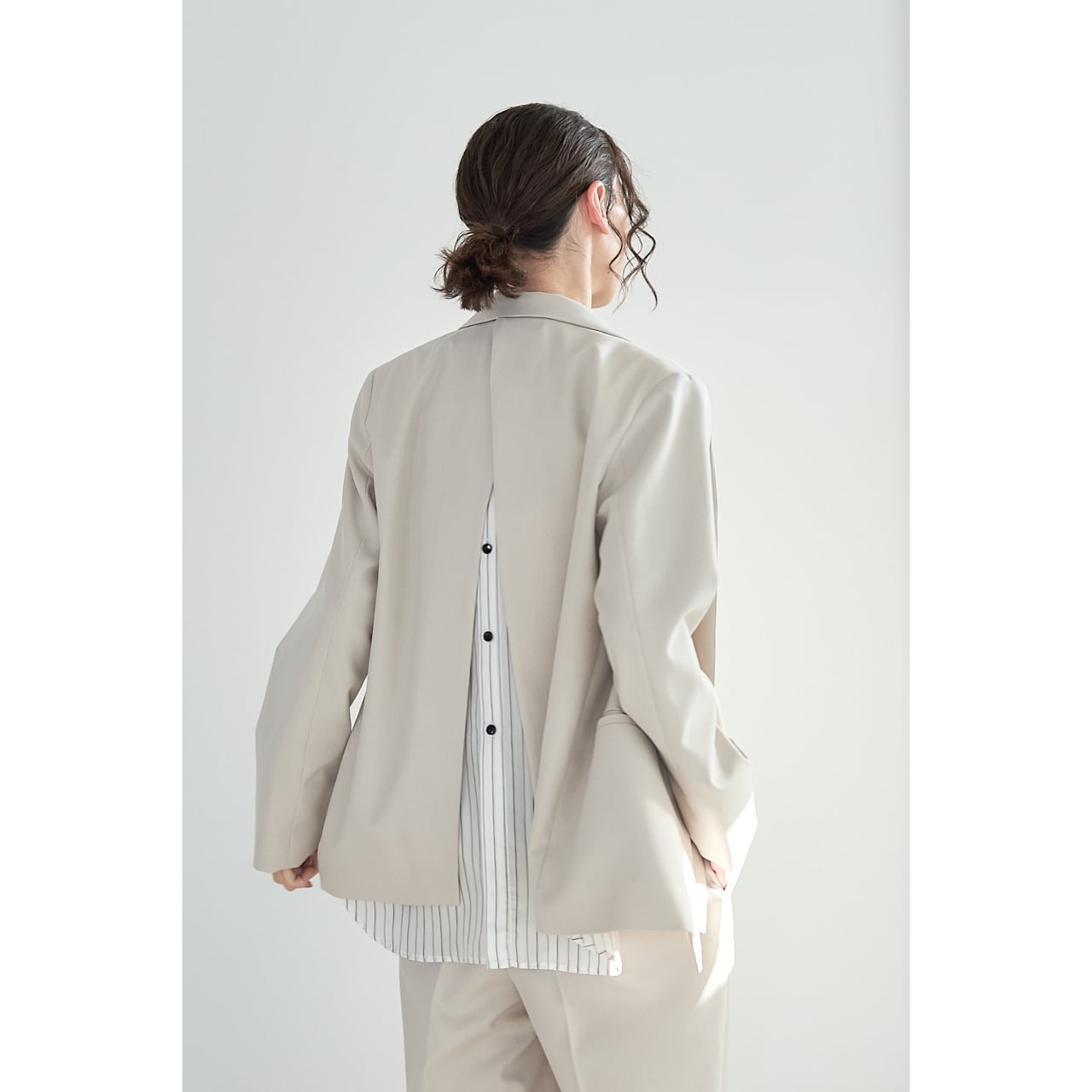バックスタイルの切り替えにはストライプ生地を使用し、後ろ姿まで印象的に。