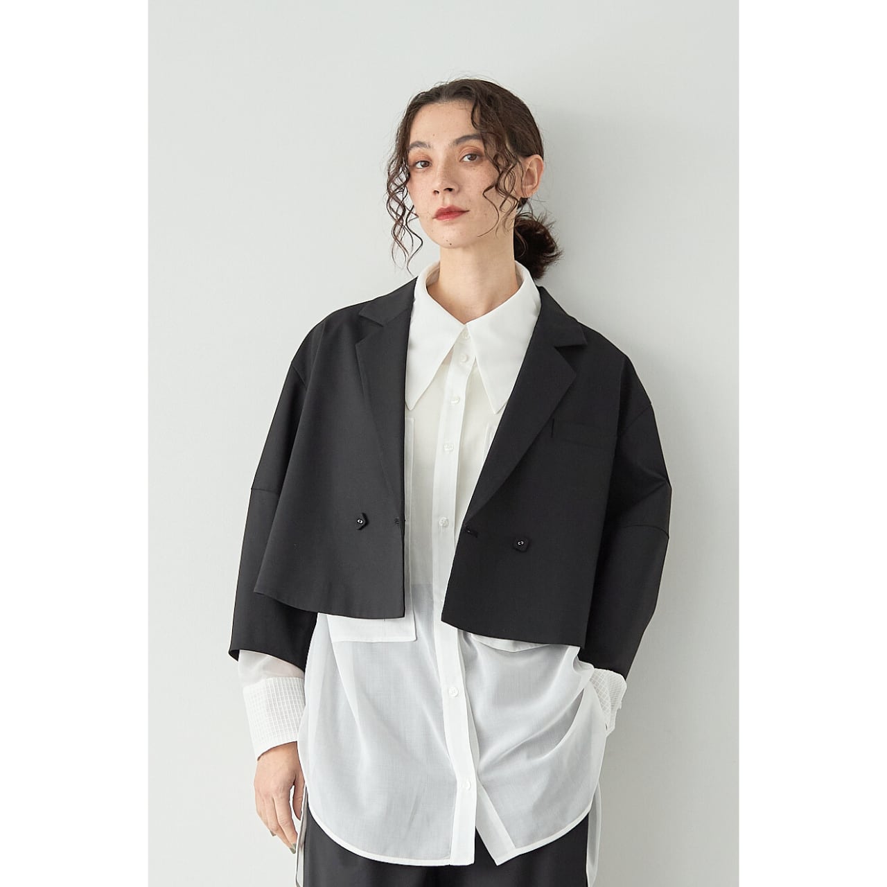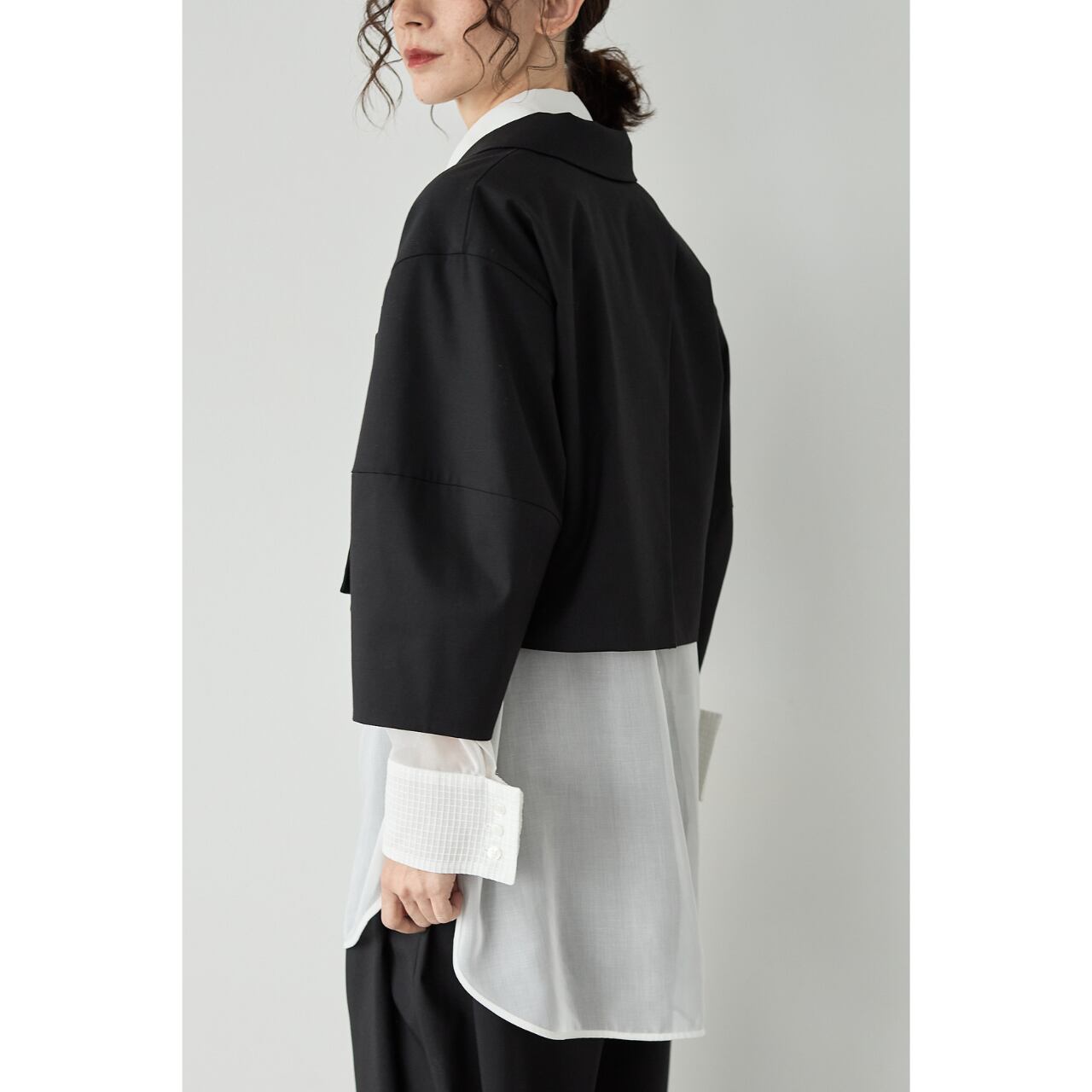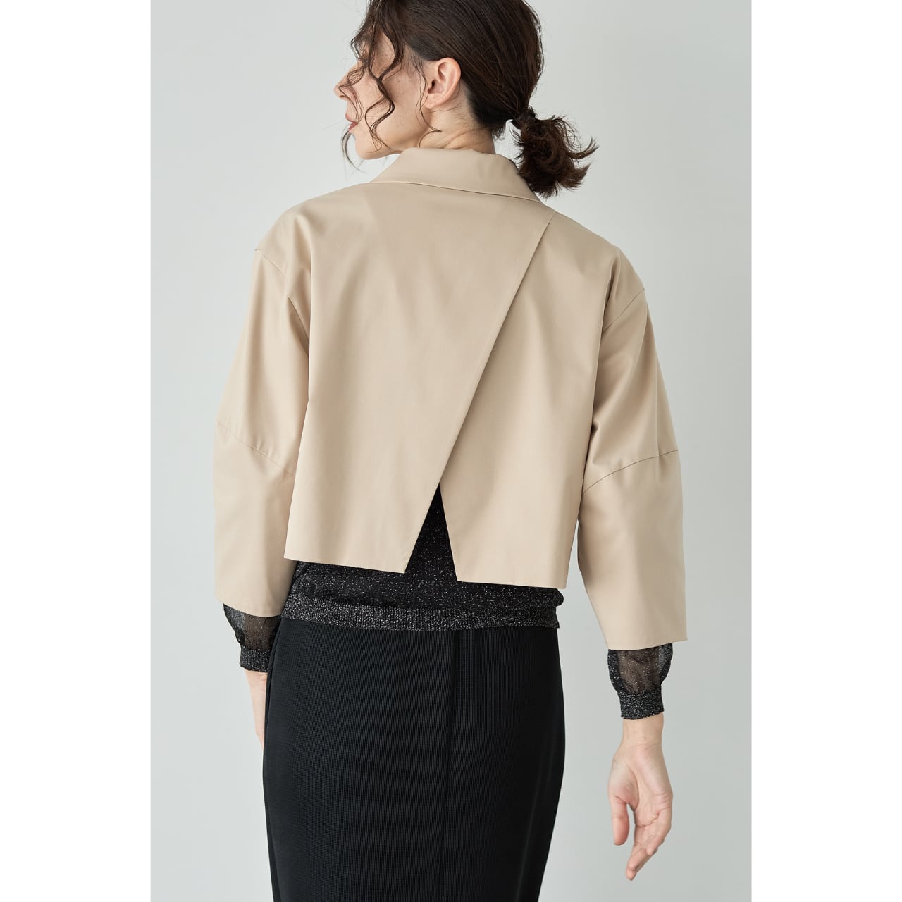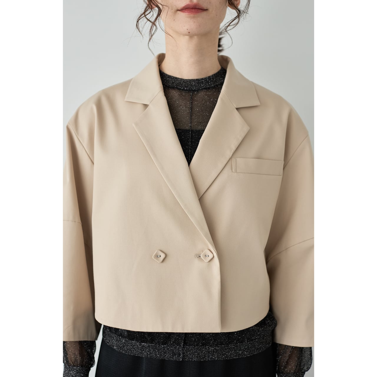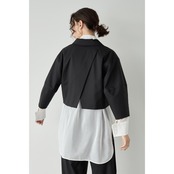 立体的なコクーンスリーブが印象的な、ショート丈のデザインジャケット。