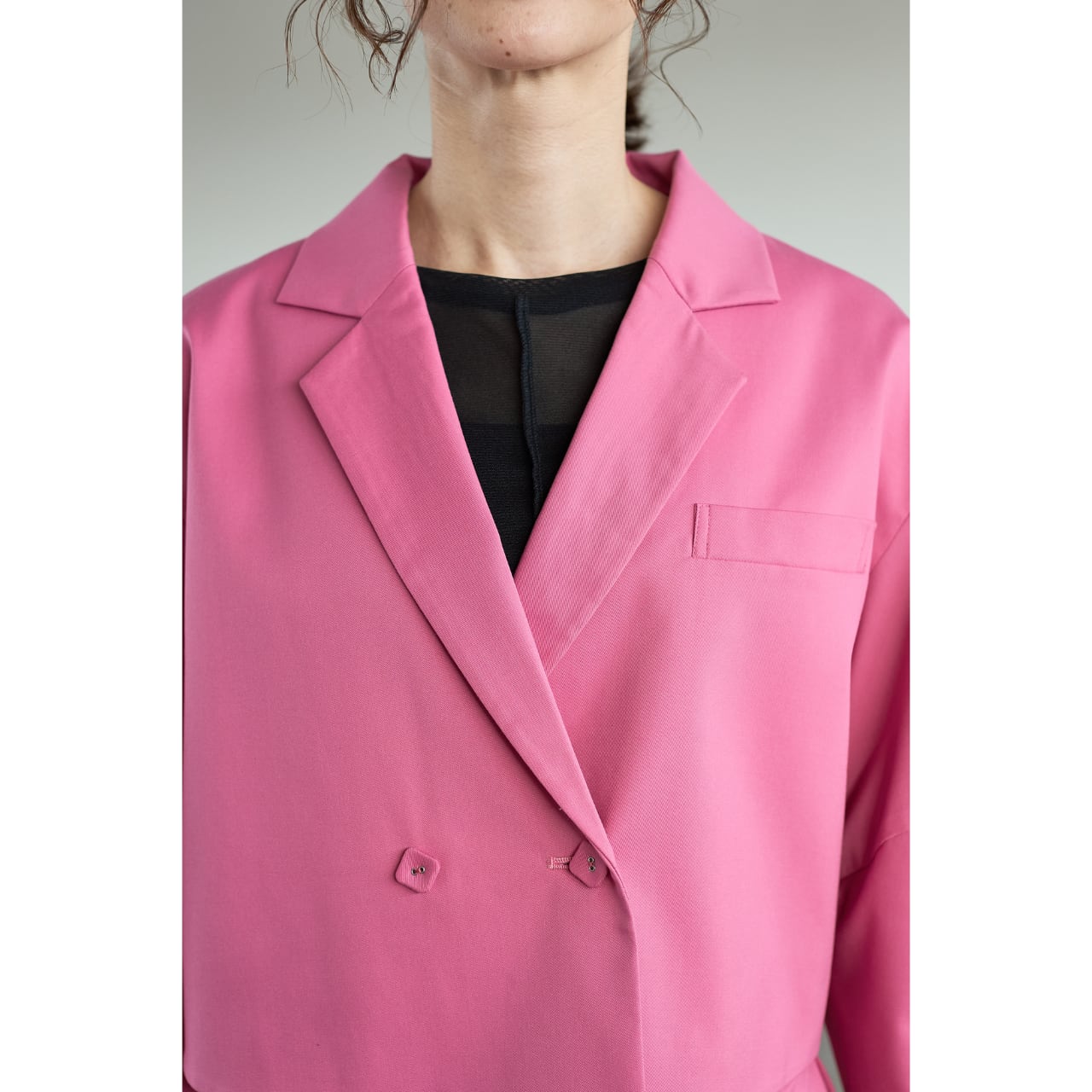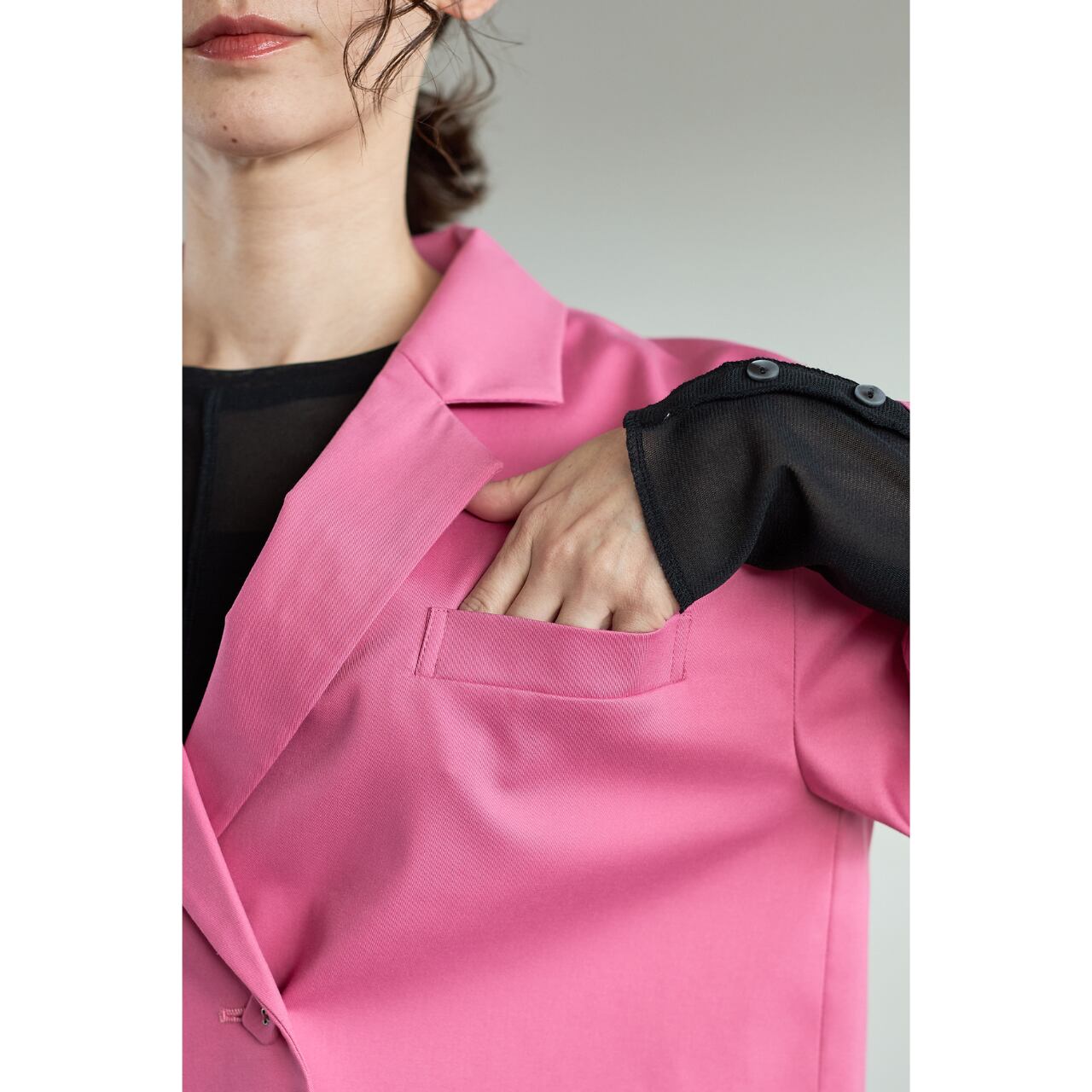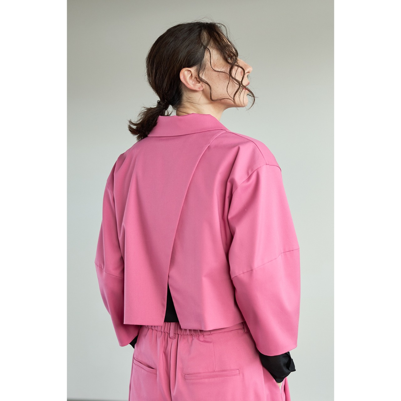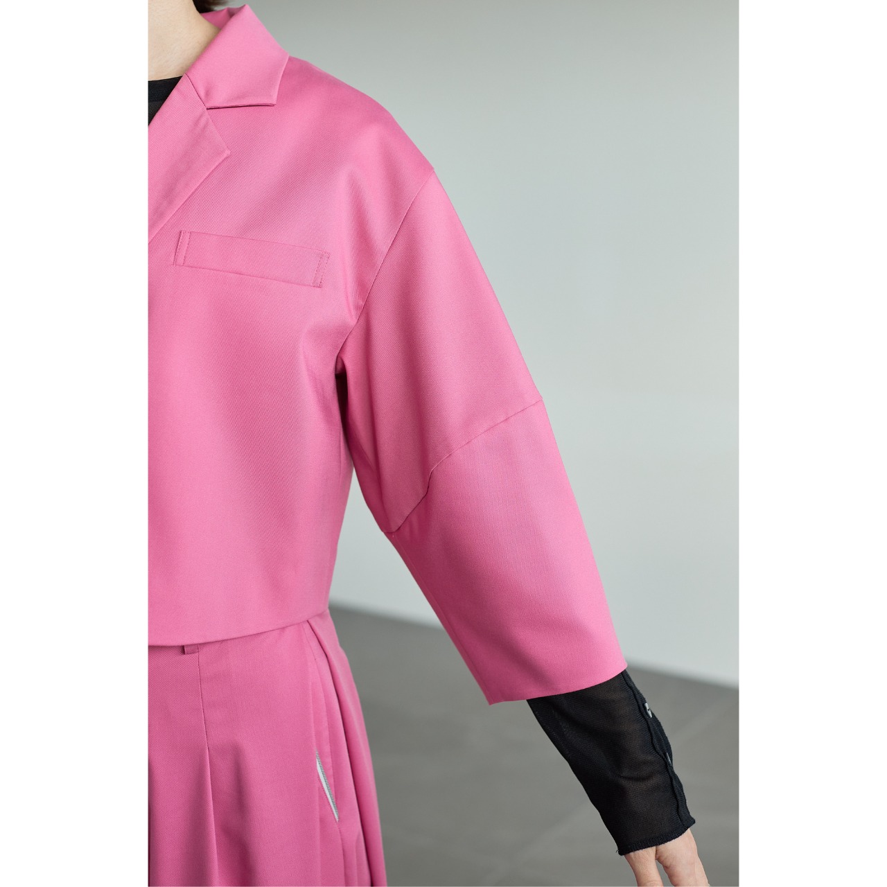 立体的なコクーンスリーブが印象的な、ショート丈のデザインジャケット。