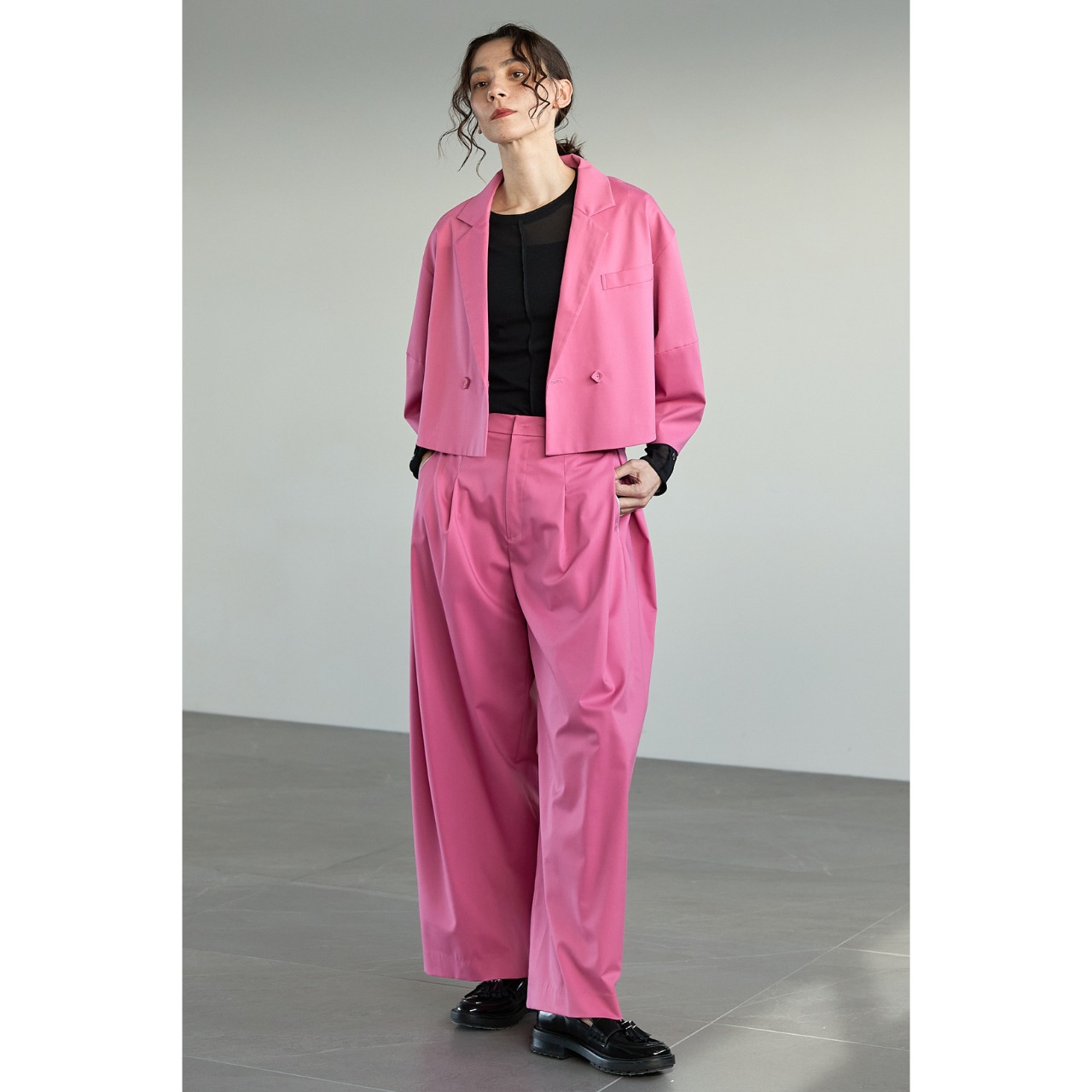 同素材の〈サイドボックスタック ストレートパンツ〉と合わせれば、セットアップとして着用可能。